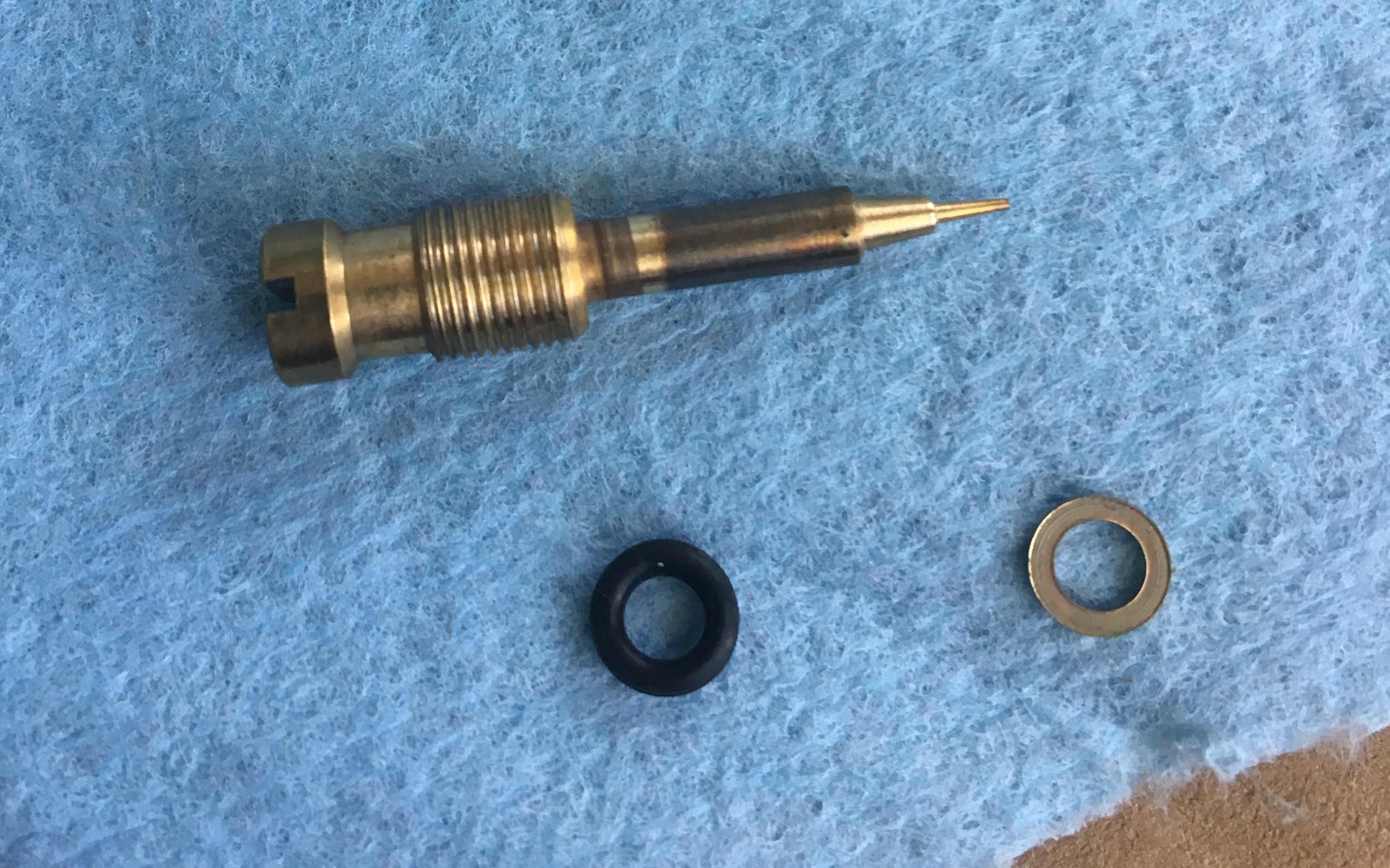 AGree with versy...that air/mix screw looks super-far out. You can remove it all of the way and inspect it for damage, etc. Here is what is should look like and also this is the order that things go back in.