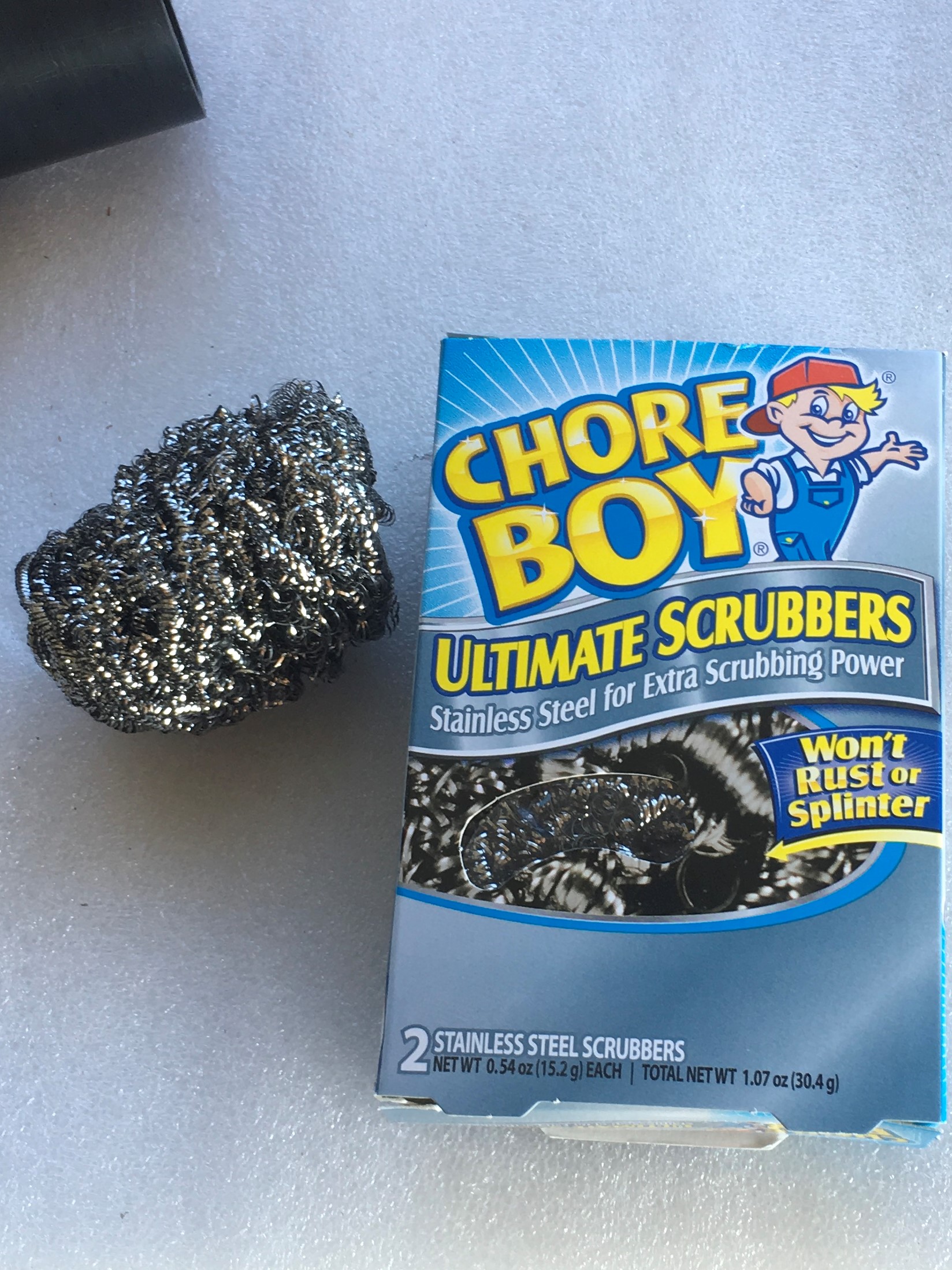 The scrubbing pad is standard kitchen fare available at WalMart or any decent drug store.  The stuff I found is stainless-steel.  Bonus!