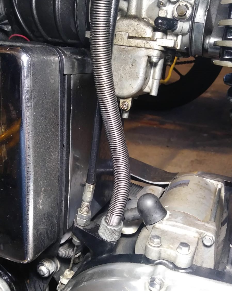 Here's a view of the area impacted- including the carb, battery box, and starter motor. There seems to be some oil migrating forward on the bottom three unpainted radiator fin outer edge, I believe from the same source, as I've yet to find evidence of a leek from the head gasket.