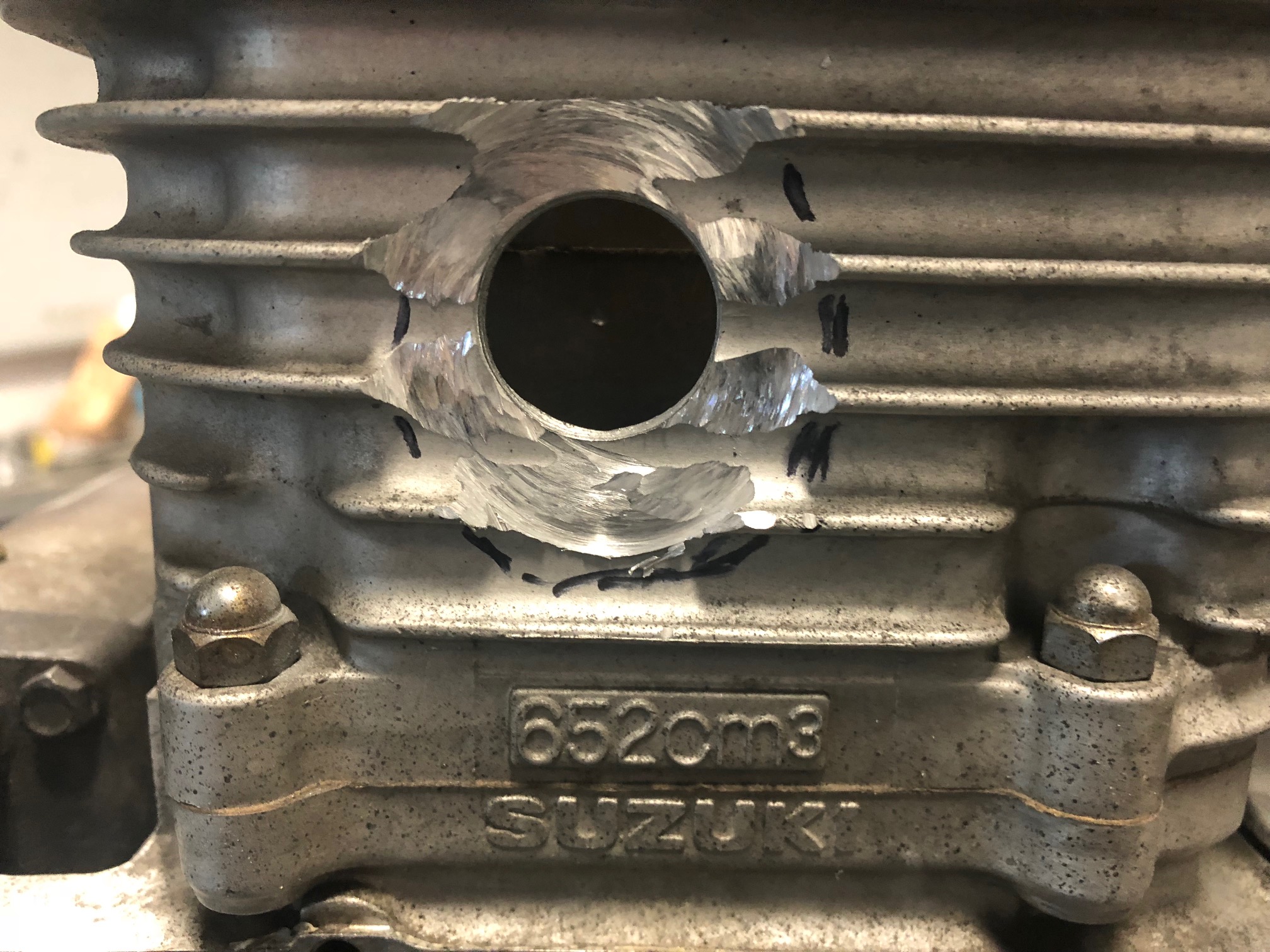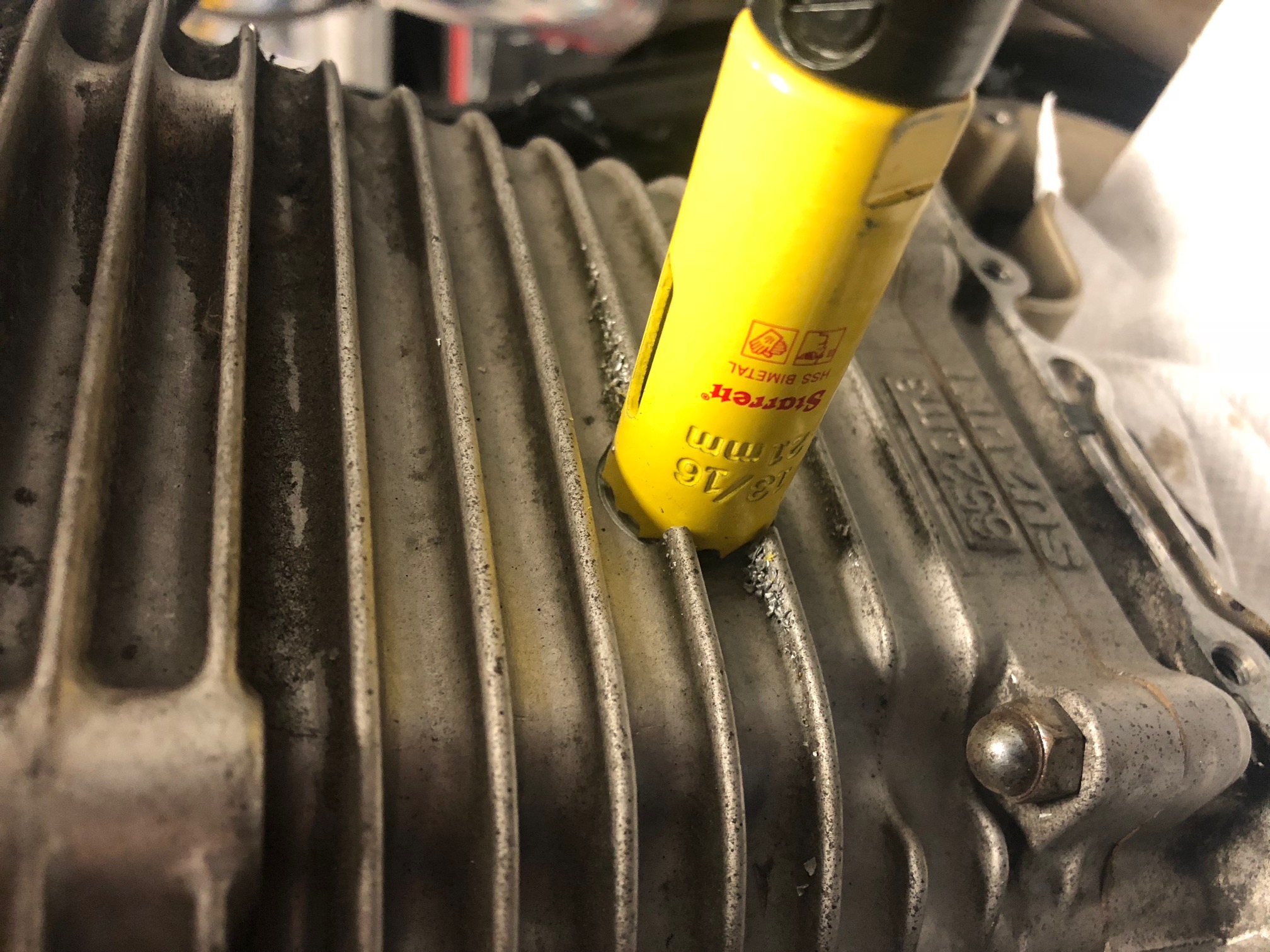 Next step was to poke a hole in the cam chain tunnel. Using a bit of eyeball-o-metrics, I picked a spot, and dug out an appropriate hole saw.