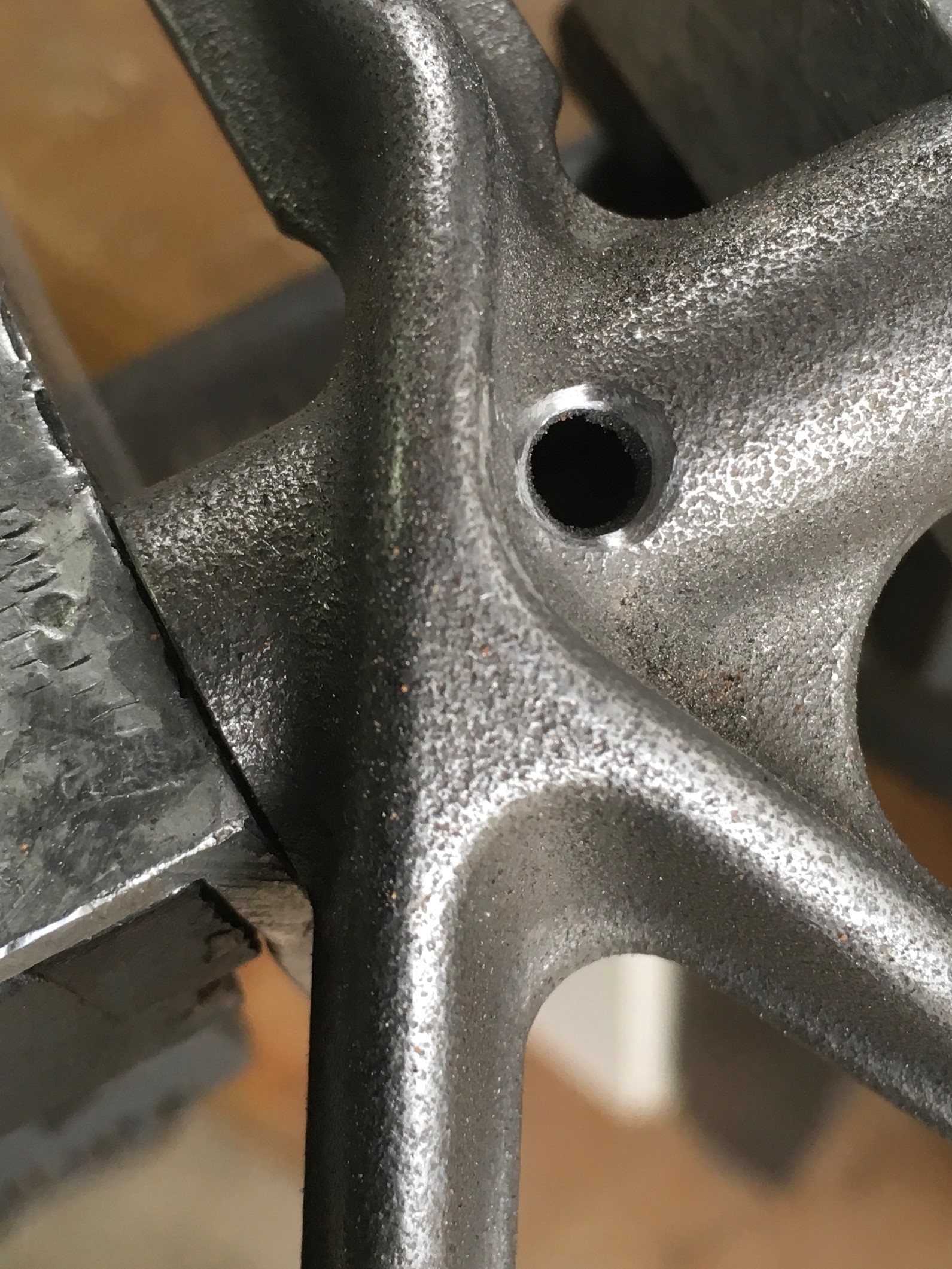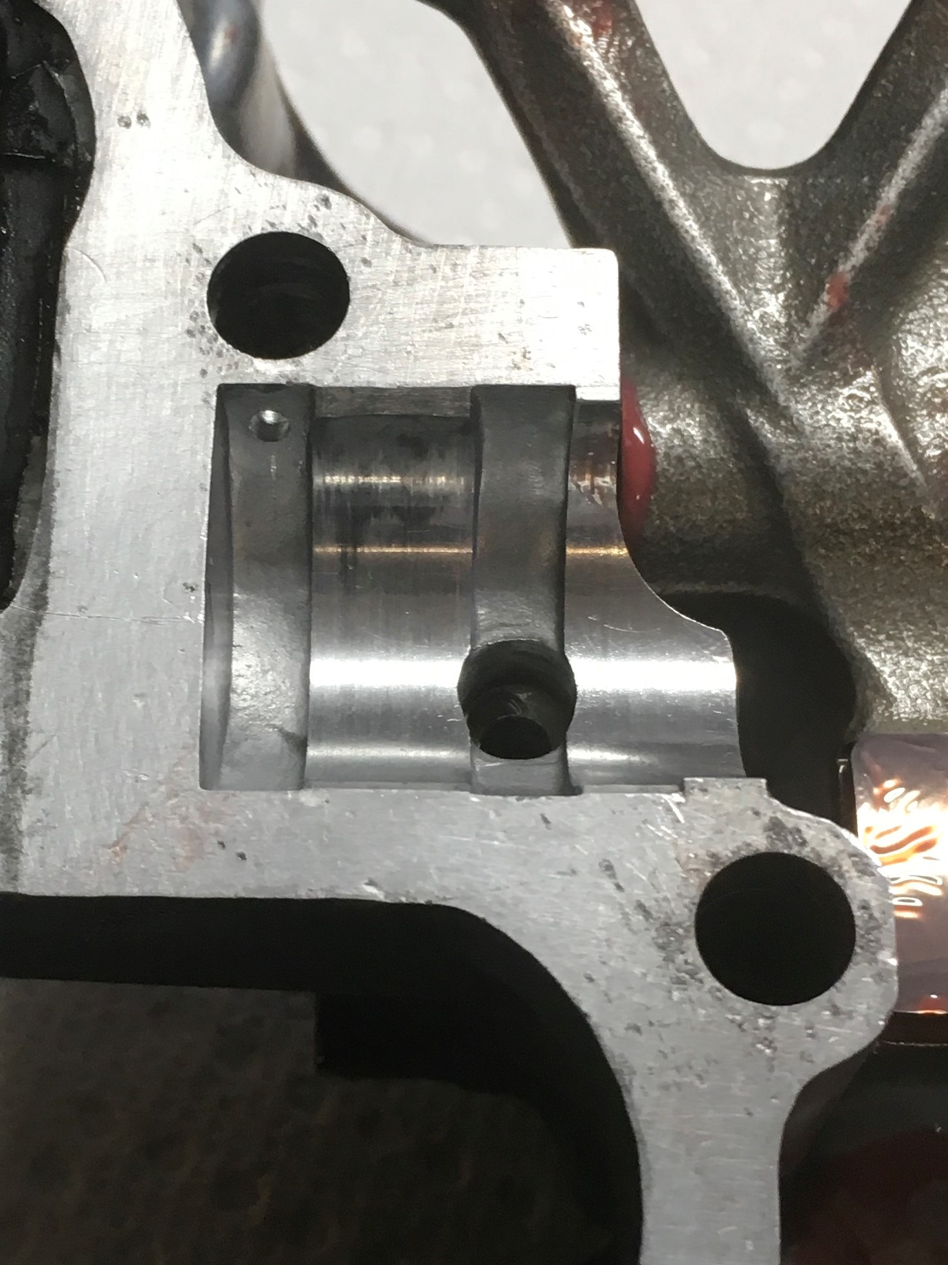 To improve oiling to the left side of the intake rocker shaft, I drilled a small hole in the left cam bearing pocket to admit oil into the adjacent head-cover bolt-hole.