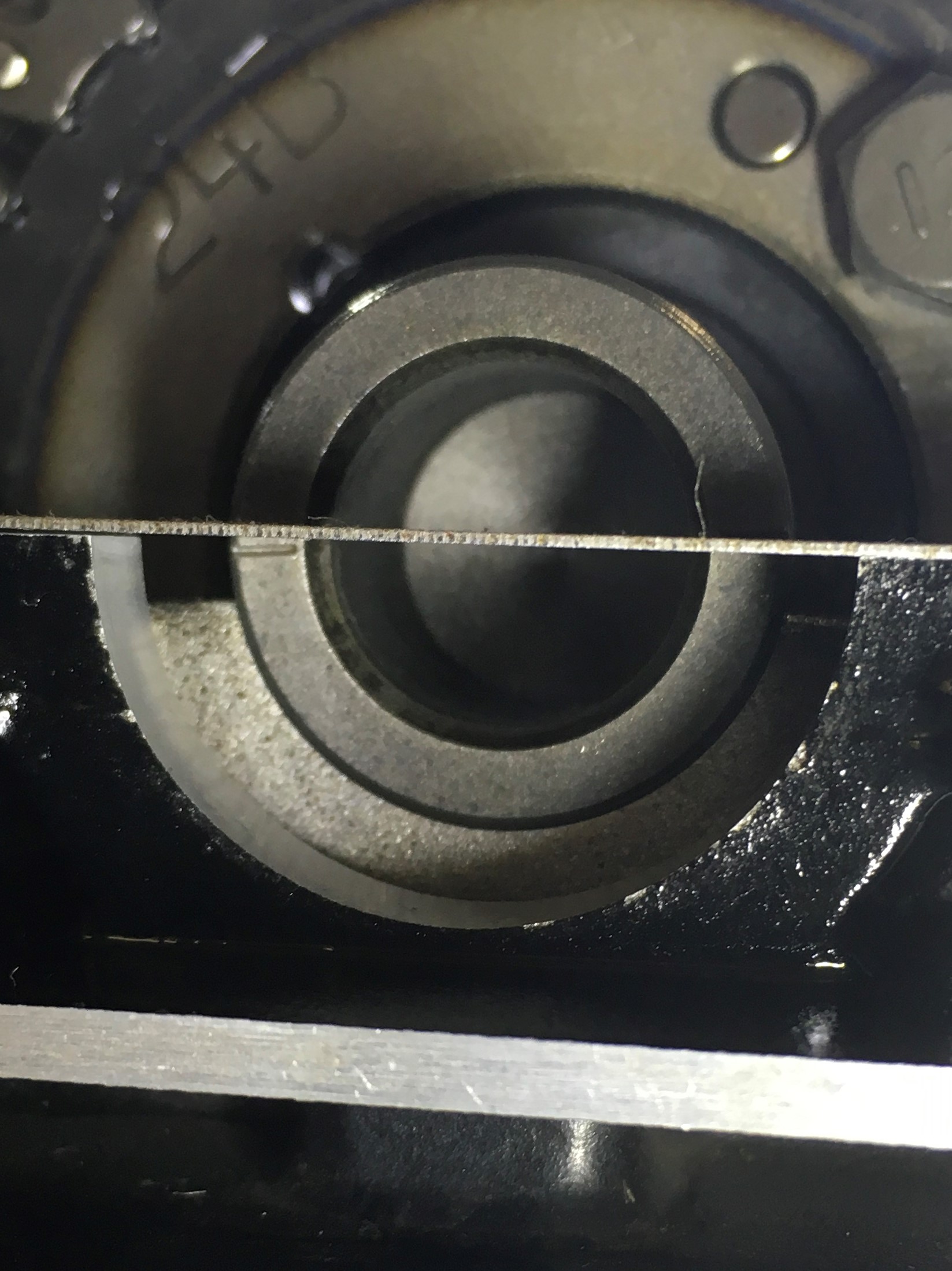 It’s a little easier to see approximately how far the factory marks are out-of-alignment if you lay a six-inch scale across the head sealing surface. With timing retarded 5°, it looks like this.
