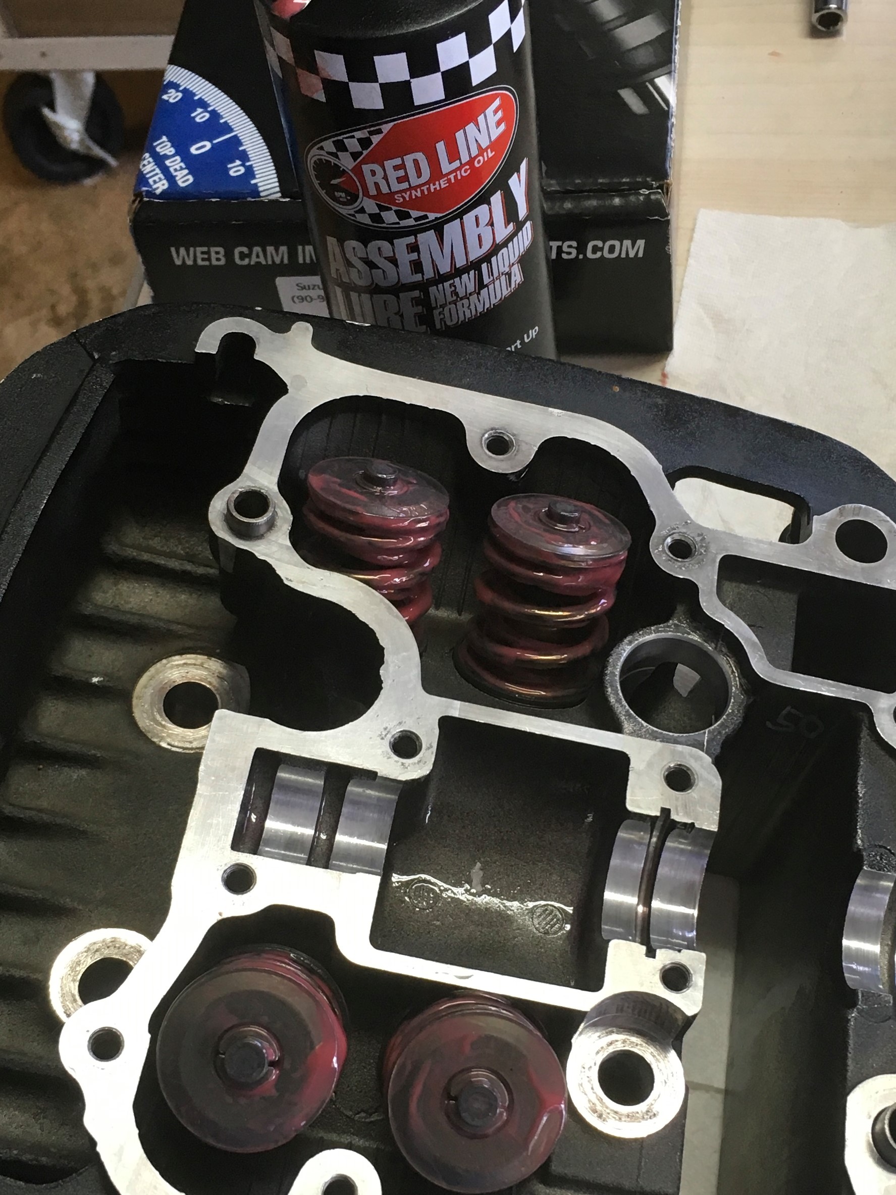 I installed the RD valve springs with the stock retainers and cotters. Massaged a liberal coating of assembly lube into each spring.