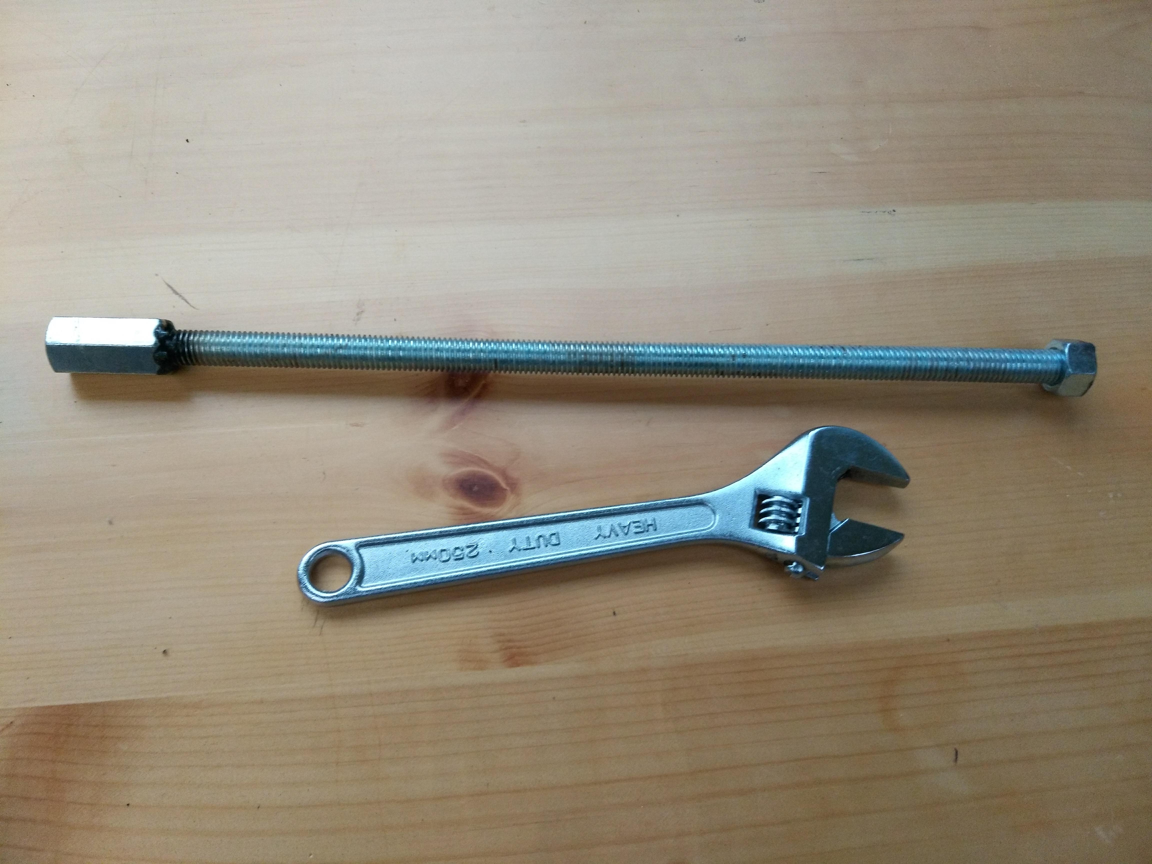 My first task which I completed last week was to lower the front forks. I built my own locking tool with a threaded rod and a coupler welded to one end and a nut welded to the other. It worked pretty well.