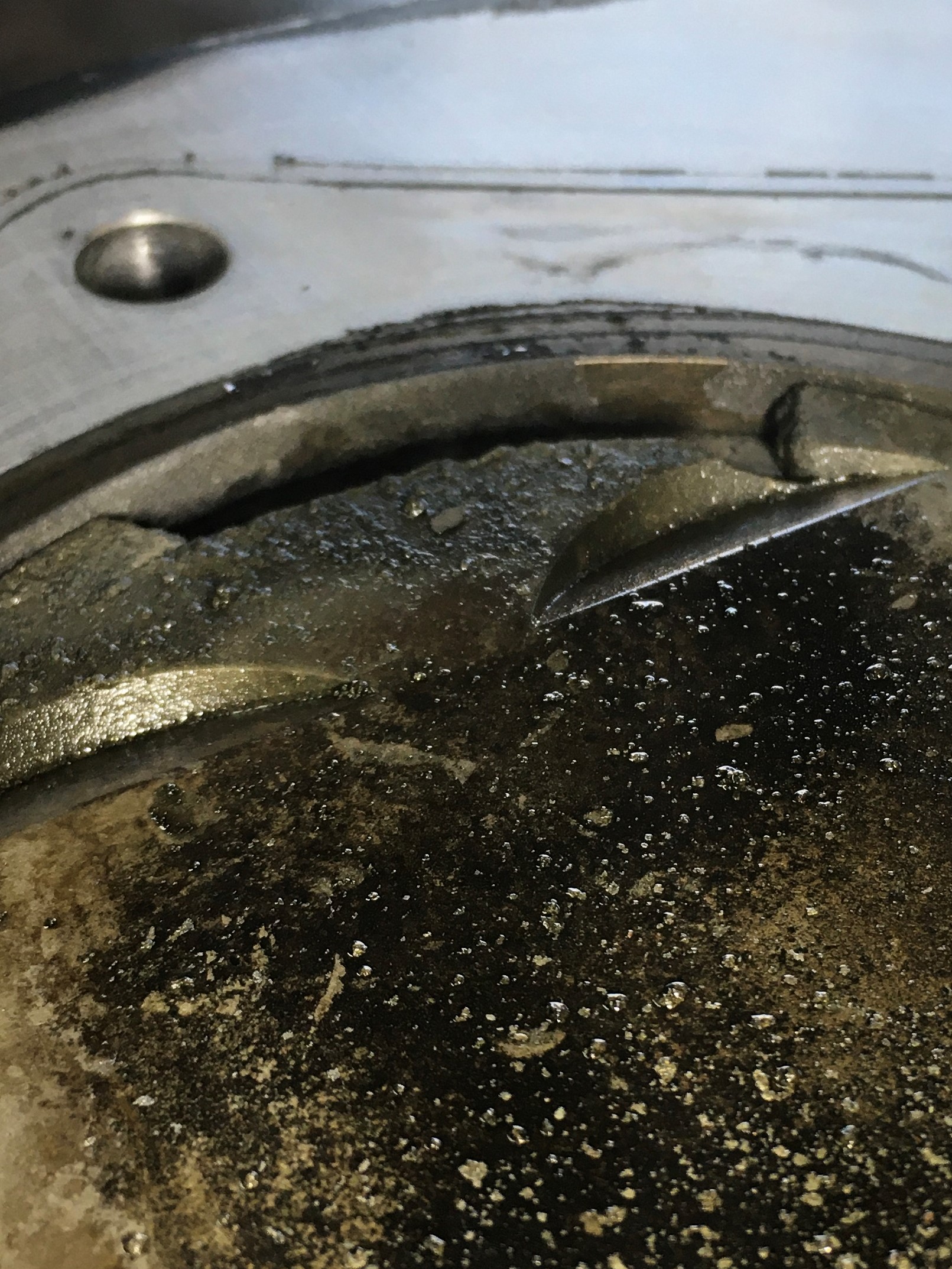 If any of you doubt that there is intake reversion when using a big cam with a late closing intake valve, look at the aluminum specs on the intake.  There’s only one way for that aluminum to find it’s way back up the intake tract, reversion.  Those aluminum specs are firmly adhered to the valve, things were warm.