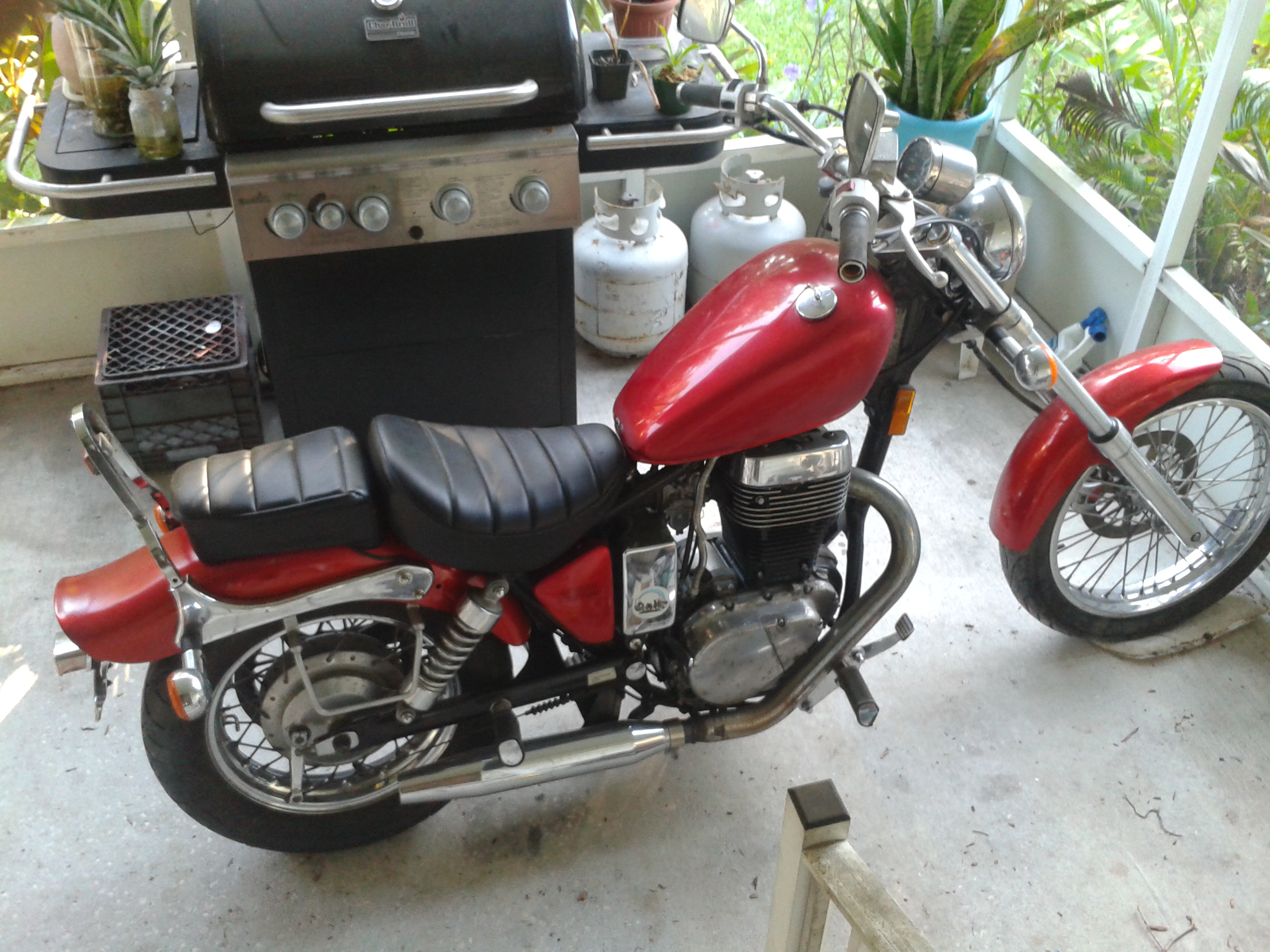 Wow, i couldnt even tell the frame had been modded. I was also wondering where you got that tank. When it's conveniant for you i'm sure we'd all love to see more pics (profile perhaps) of your bike! Also, am i mistaken or is that a different rear fender (honda rebel)?
