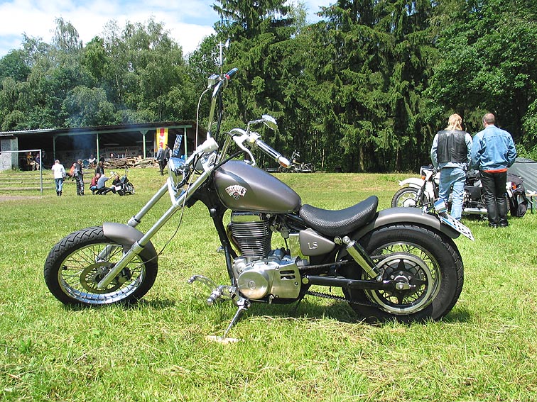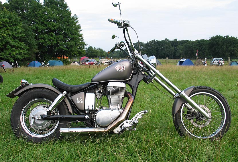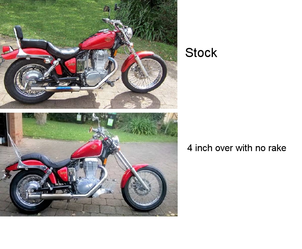 Ok there is the element of style, but a lot of mods are about style while improving function. This savage I got with a broken fork. It would have been simpler to slap on the exact same forks and let it be. But, I had to machine up triples with the rake - well for looks, however I ended up with a bike that didn't have that heavy feeling front end. I honestly urge you to find a bike that was raked with a dirt bike fork set where the axle is set trailing the fork legs and has a 21" aluminum front wheel and try and see if you can ride it. The lower and slower rotating mass of the lighter front wheel, the longer but stiffer and fatter fork legs, the drag bars I fitted off a Harley, and the most important aspect - reduction in trail make it far easier to ride than a stock savage.