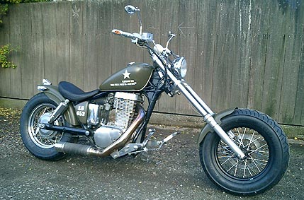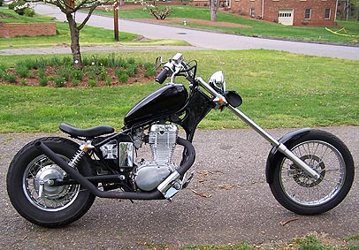 Whaaaaa ... no I did nothing to no perfectly good motorcycle, I bought this one with a busted set of forks, then fabbed up a 9 degree raked triple set and machined the fork spacing and diameter to fit a dirt bike FE (KX 125 from 1989 if I recall) and fitted all the FE parts onto it.