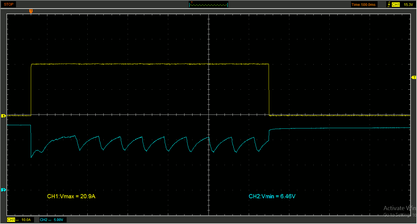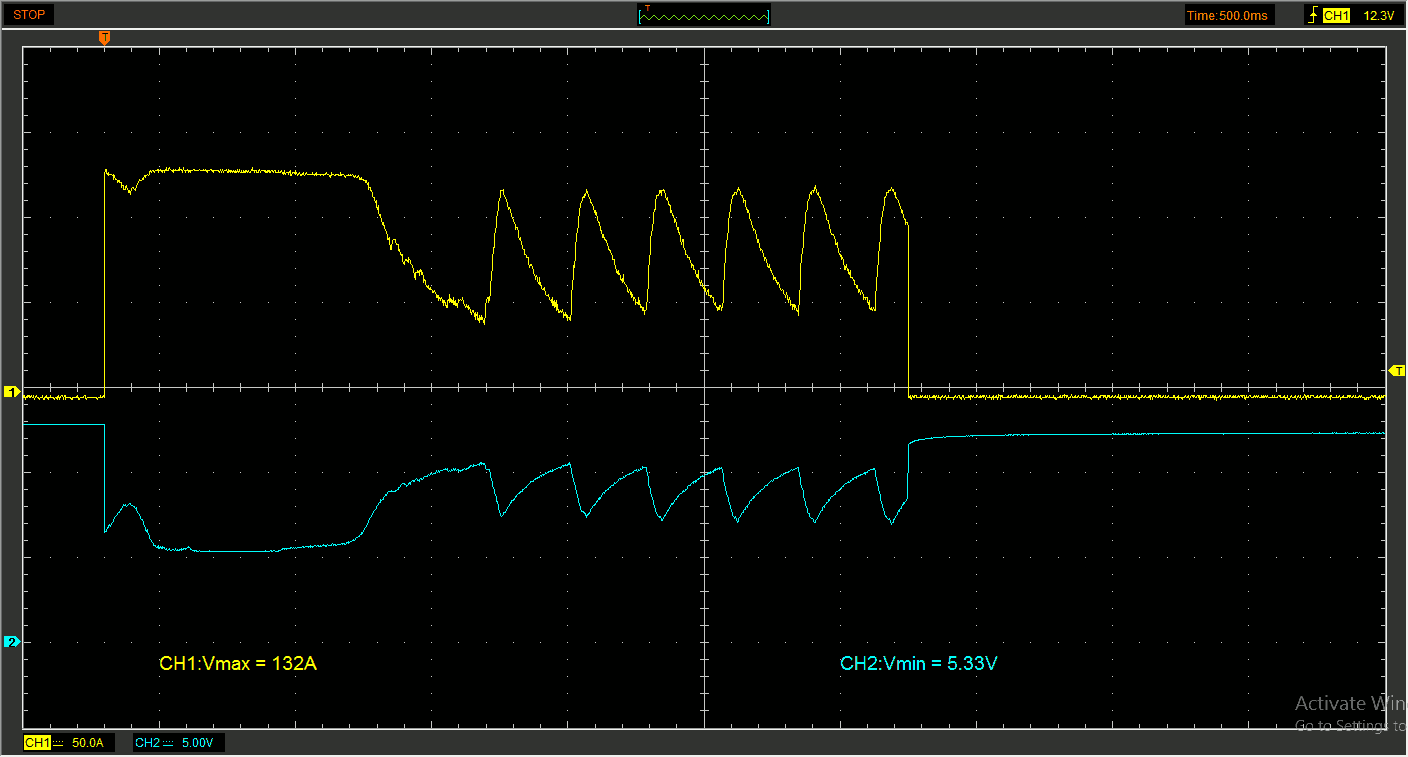 Today I took some current measurements on my engine which is still out of the frame. I wanted to see how much current the starter draws without the solenoid and this is this first oscilloscope reading
