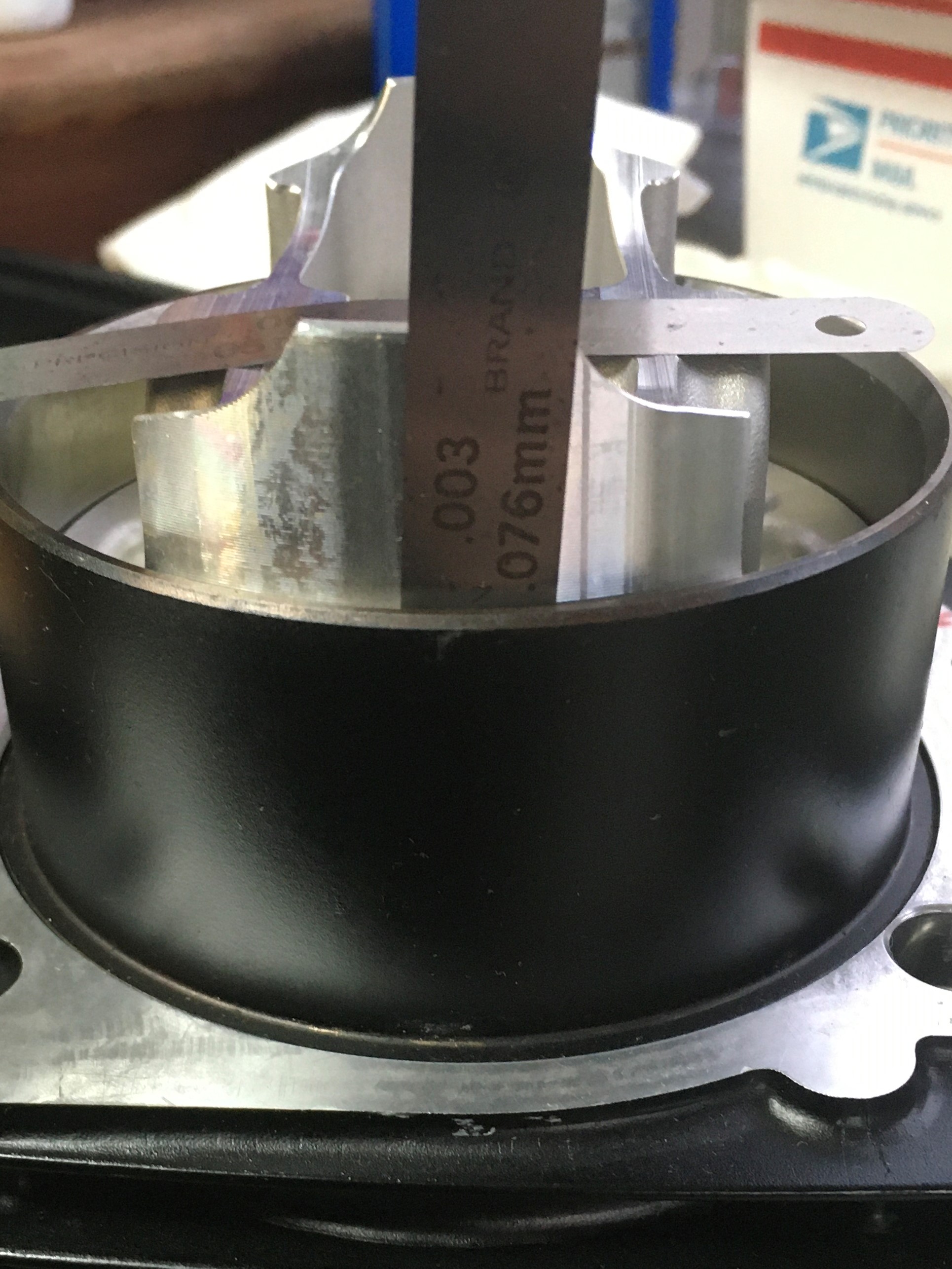 Once the cylinder is in place, you can run the piston up to TDC and get a look at the deck height.  You can see that the Wiseco is situated well below the deck (.143” to be exact).  No effective quench on this motor.  With the Wiseco, you have to rely on port tumble/turbulence to get the mixture stirred up, not gonna be any squish working on it.