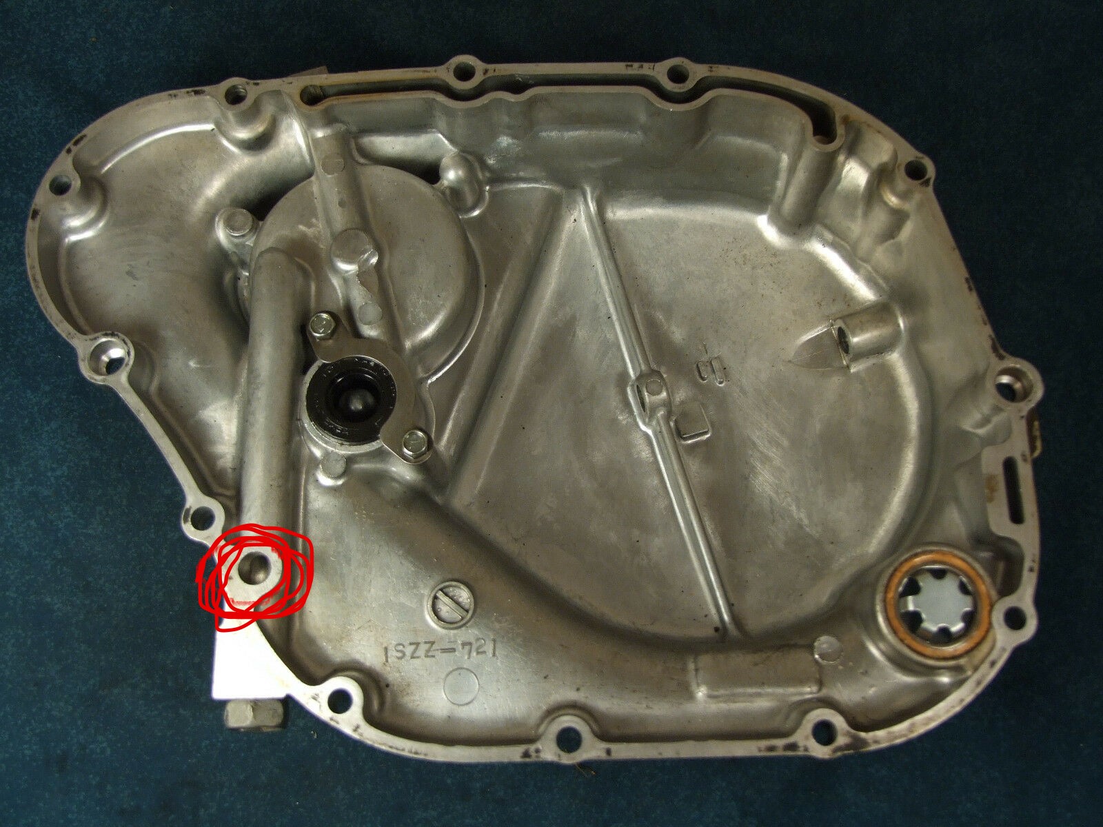 Filtered oil then enters this hole where it is distributed to the crank, top end & transmission.