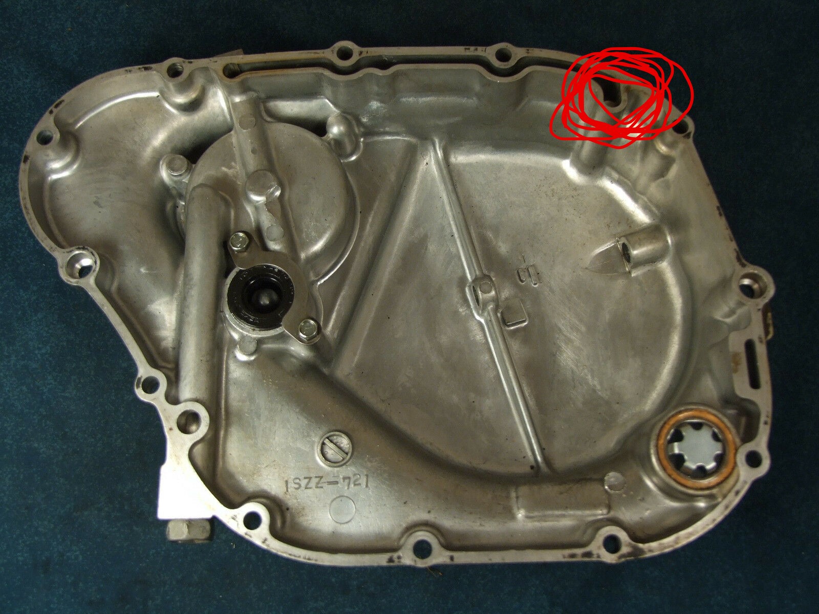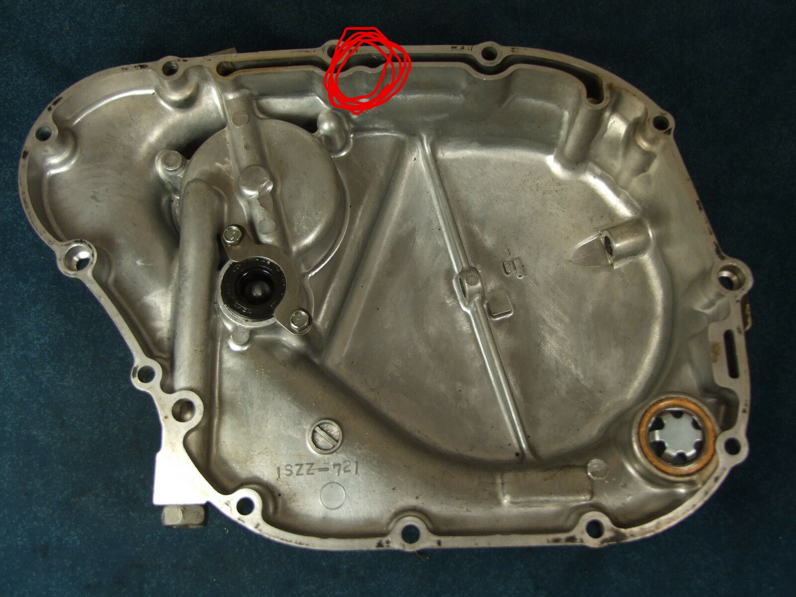 Another internal passage in the cover directs oil from the filter up to the groove in the cover. This groove distributes oil to the top end and the transmission.