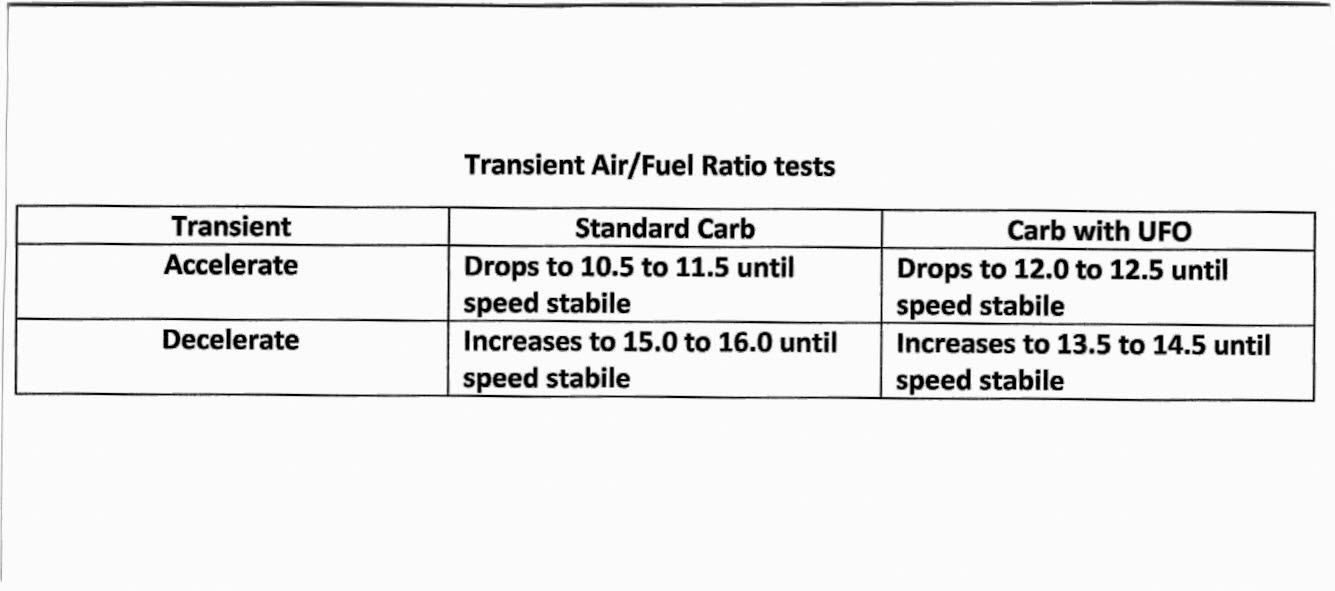 I observed the air/fuel ratio behavior during transient operation. I would roll the throttle on and accelerate at a moderate pace, then shut the throttle and decelerate. Note that on deceleration, the standard carb configuration had very mild afterfire, the typical cackle/crackle, but never any KABOOMS. The UFO carb had absolutely zero afterfire, no cackle/crackle, no KABOOMS.