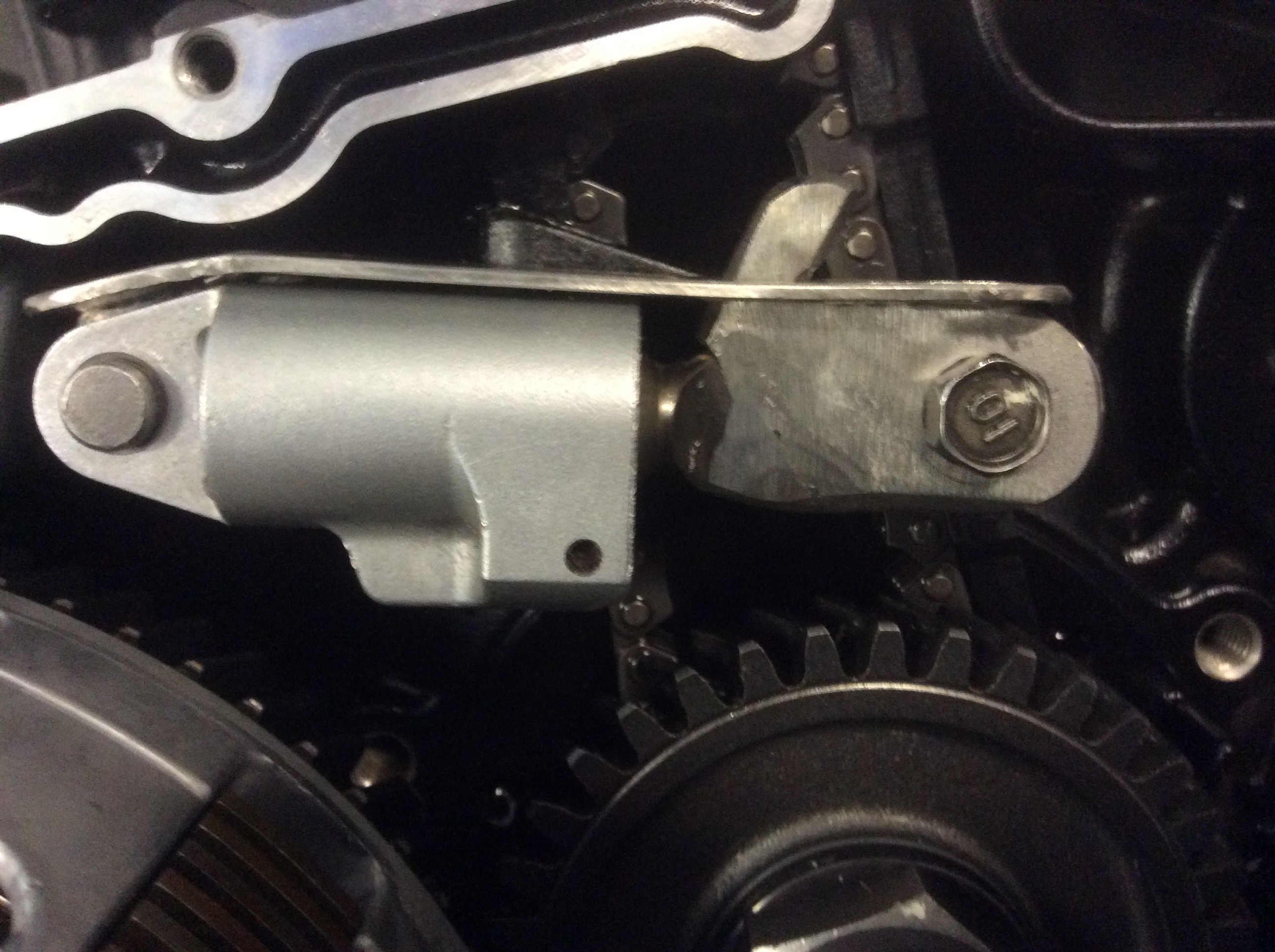 The post that supports the tensioner has a long thread into the engine block so by putting 3mm of washers behind it it is possible to run a guide arm over the 12mm part of the post and extend the tensioner