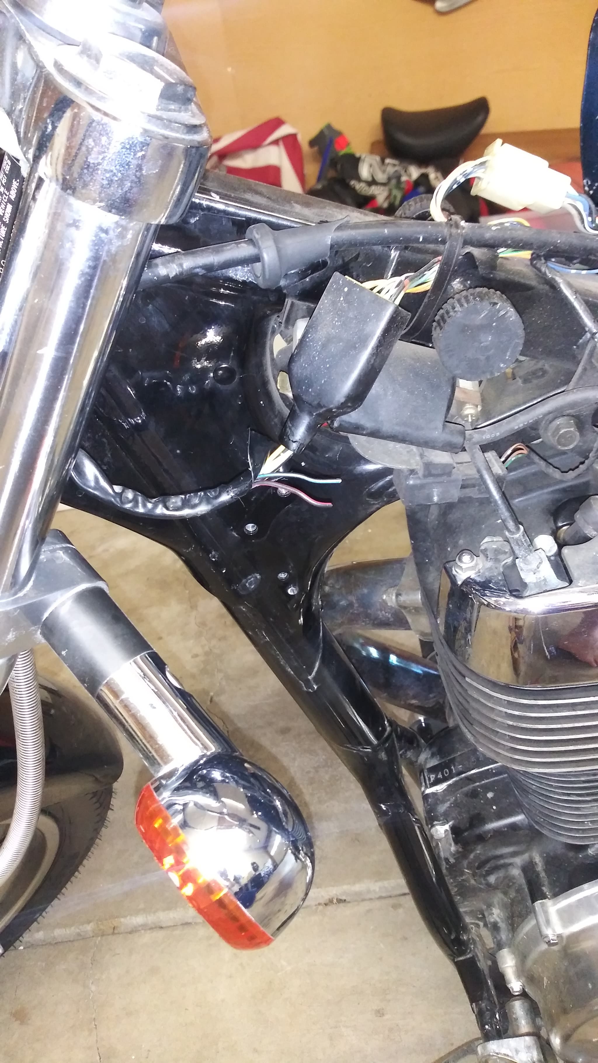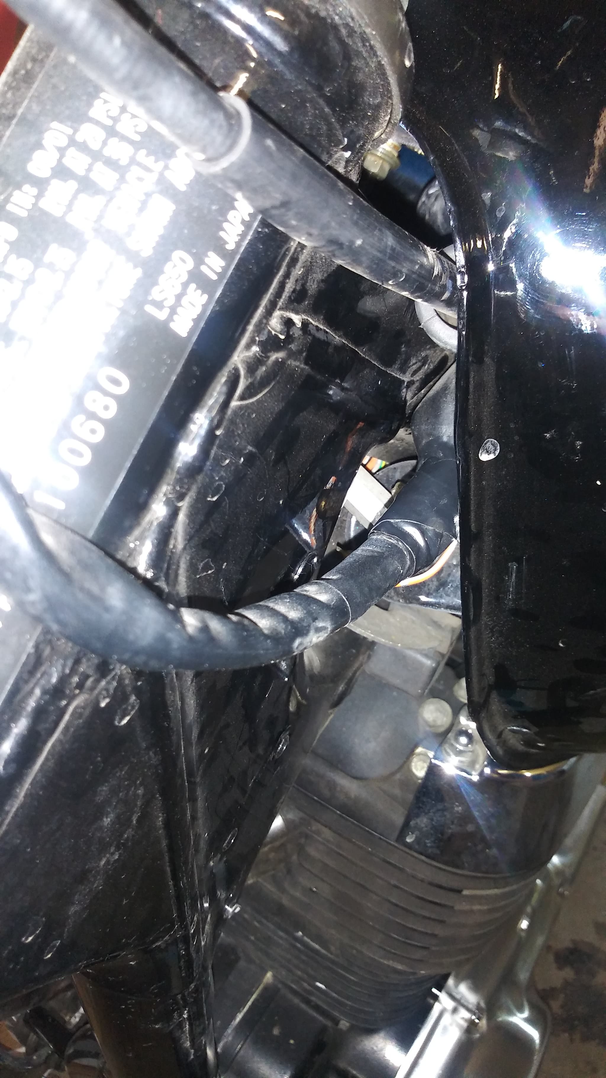 I think I'm just going to try to pop the seat off and scoot the tank back just a little without having to disconnect anything so I can get a better look at the lower cable in pic 3. I'm pretty sure my inputs for the horn are wrapped up in that electrical tape for some reason.