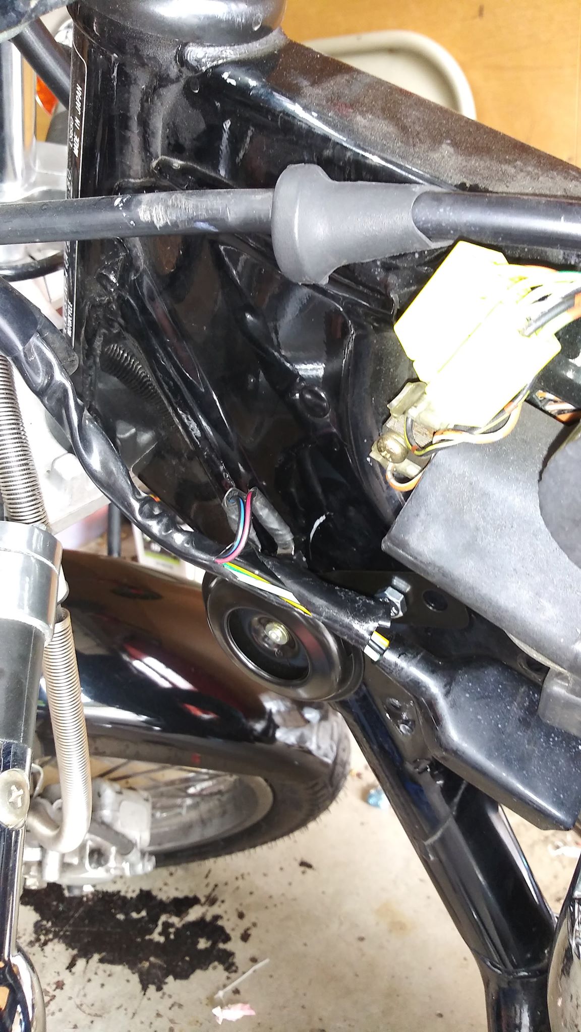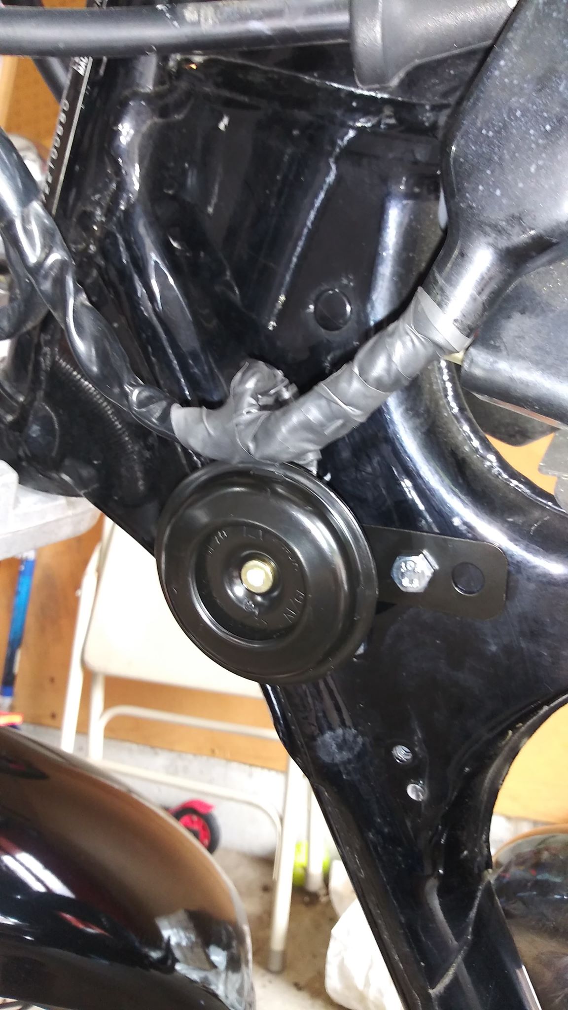 I wonder I cant see any horn but a lot of tape! To that, my horn is still conected to my main wiring inside the healamp for som purpose.. probably becuse its better in wet conditions? In any case its a 12 volt horn, the trouble is to find the right wiring to conect it? In any case I tryed to put some fotageges from my 2000 Savage, they have strap it a lot but in the end its goes inside my headlamp anyway. Its a 12 voltage horn, put it anywere you like to have it, find the virings anyhow, that comes frome your handelbar!