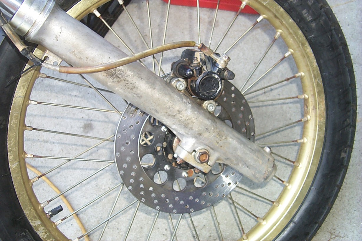 The rear end was lightened by tossing the fender, rear seat sissy bar etc etc etc as well as that boat anchor of a muffler and the carrier bracket was cut to just the minimum required to slap the exhaust can. Instant nirvana - just from that, but the handling is where the front end shines.