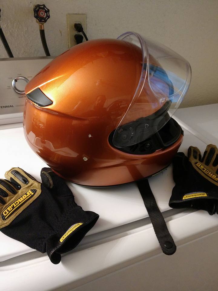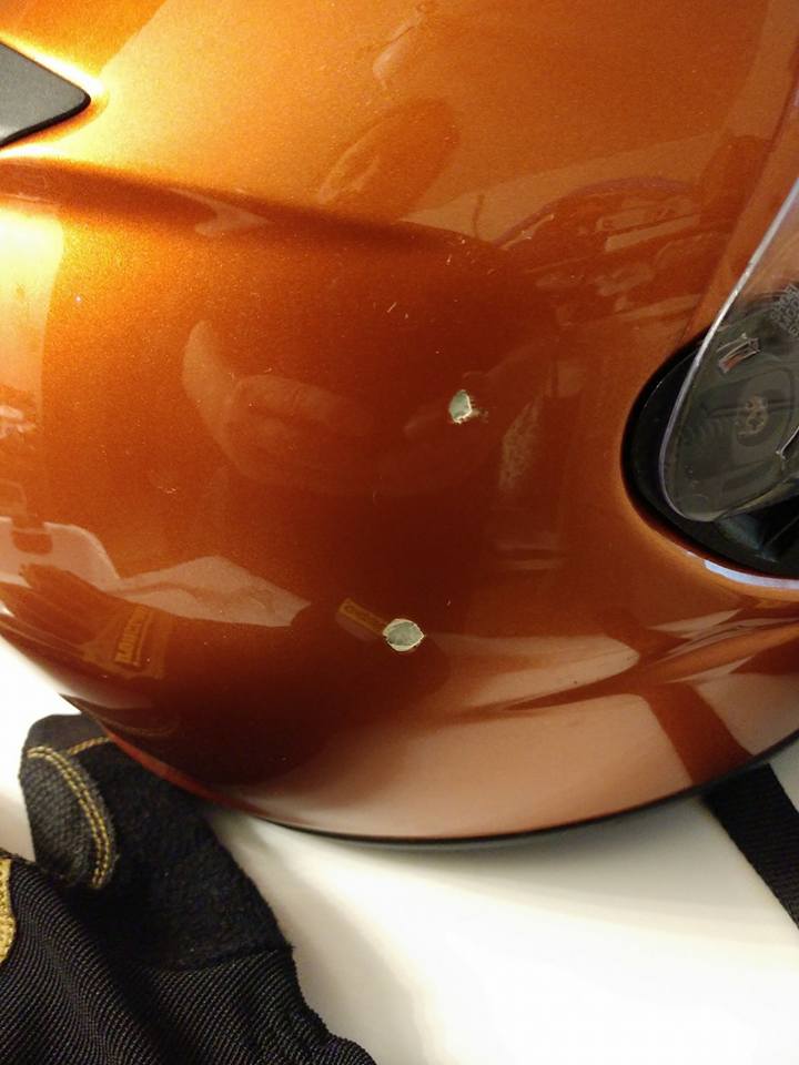 Love my helm (Shoei) because the color almost matches my fuel tank. I'm fine with a smidge of "battle" scarring. Thinking I'd like to fill the pits and either touch up enamel or sort of "patch" it with some kind of metallic hue tape.
