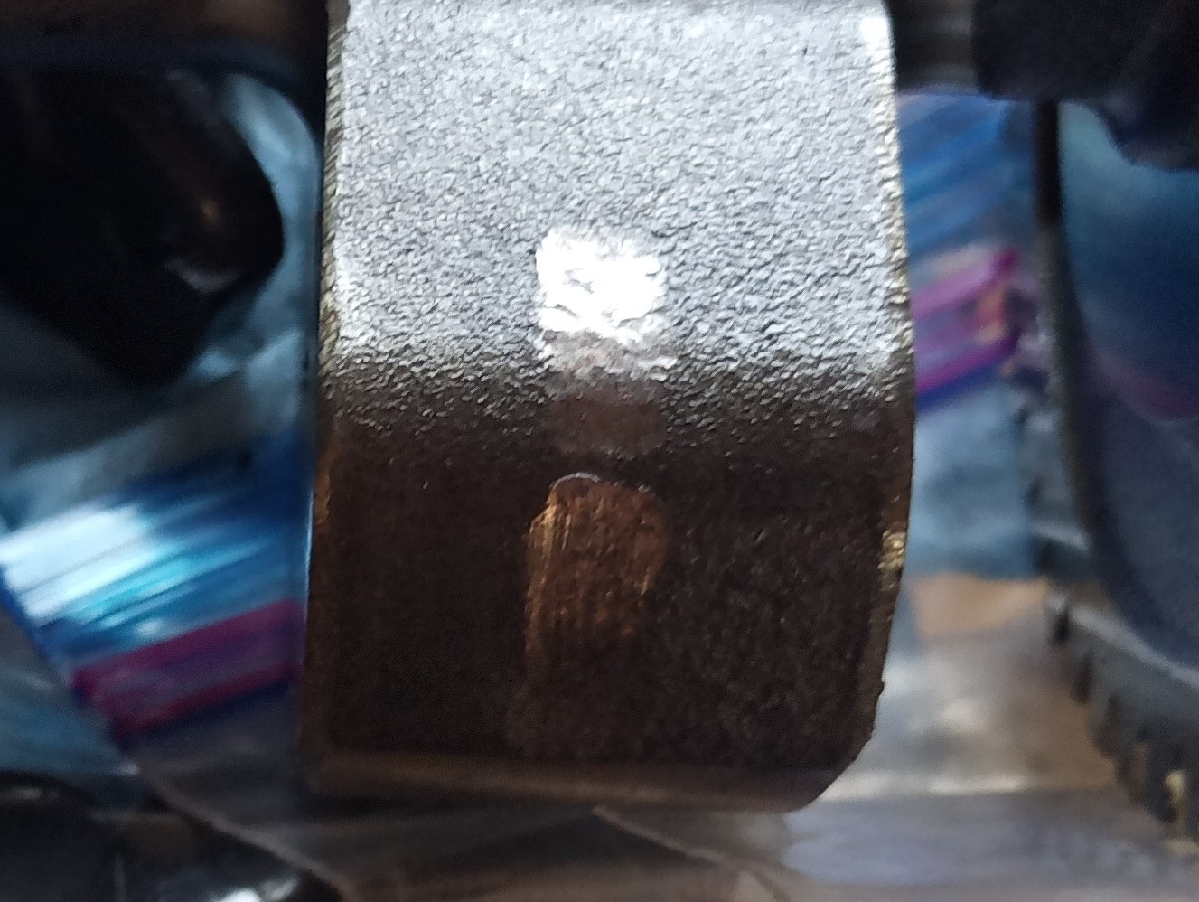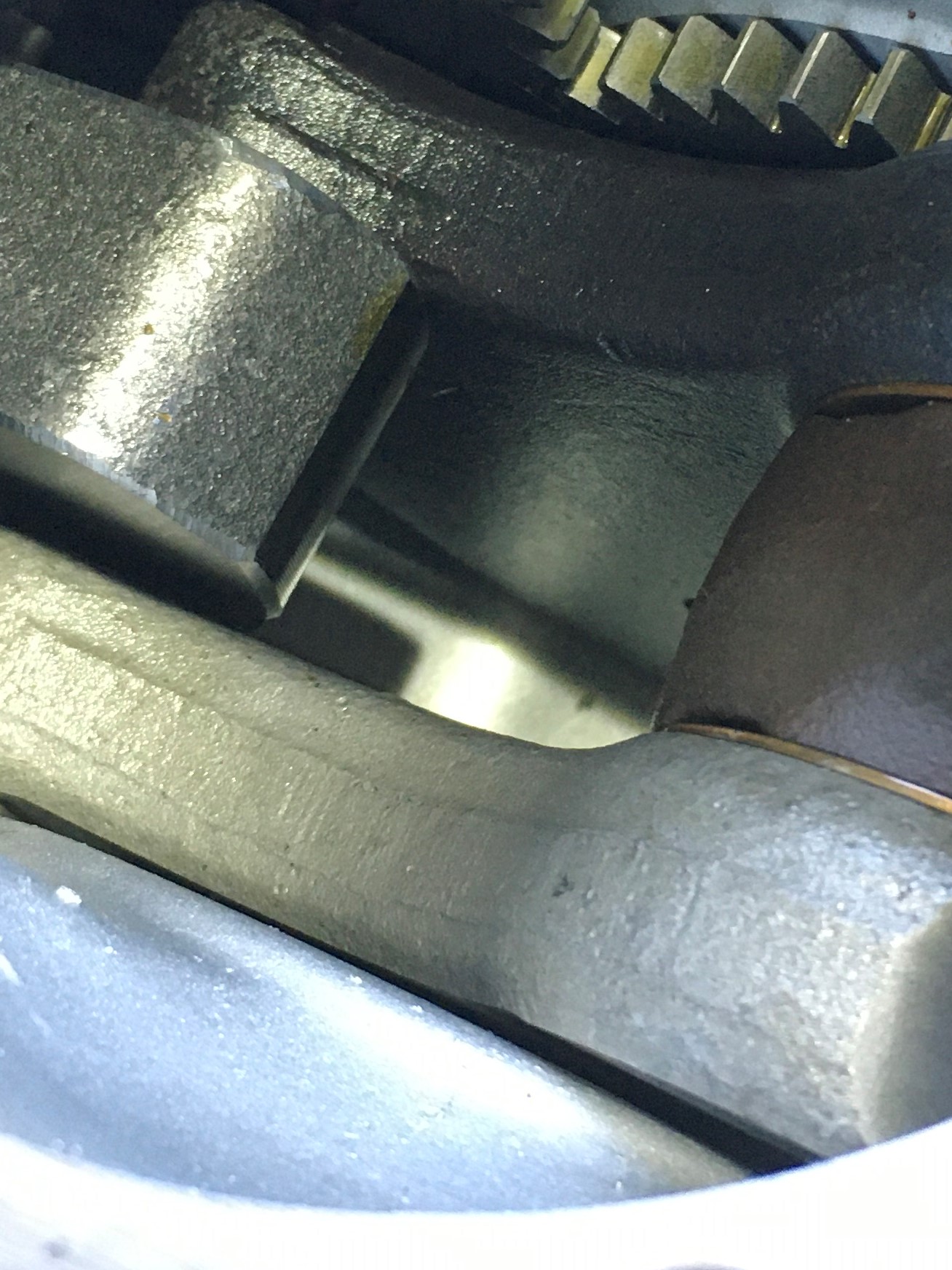 This picture shows the con rod approaching the balancer weight.  While the rod is moving toward the weight, the weight is moving away from the rod.  This is the only position where the rod could conceivably line up with the portion of the weight that has the heavy rub.  In this position, there's like over an inch of clearance between the rod & weight.