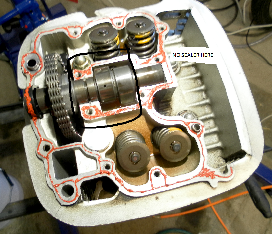 And as DragBikeMike stated in post #8.....you put sealer on the sides of the little oil reservoir along the cam....it should not be there. Look at the head cover, and if there is not a matching surface on the top for the sealer to squeeze between - don't put sealer there.