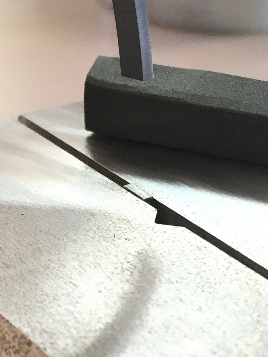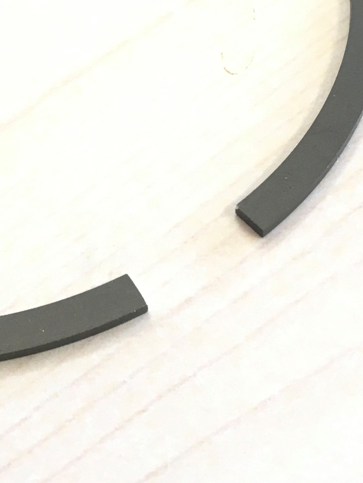 So, I held the ring gently in a machinist’s vice and used abrasive paper wrapped around a ¼” tool bit to remove material from one side of the gap. Take care to follow the existing butt such that when the ring is installed in the cylinder the butts are parallel. I only had to remove a few thousandths of an inch to get this 2nd ring close to perfect. Check all the edges of the butt and verify that there are no burrs.
