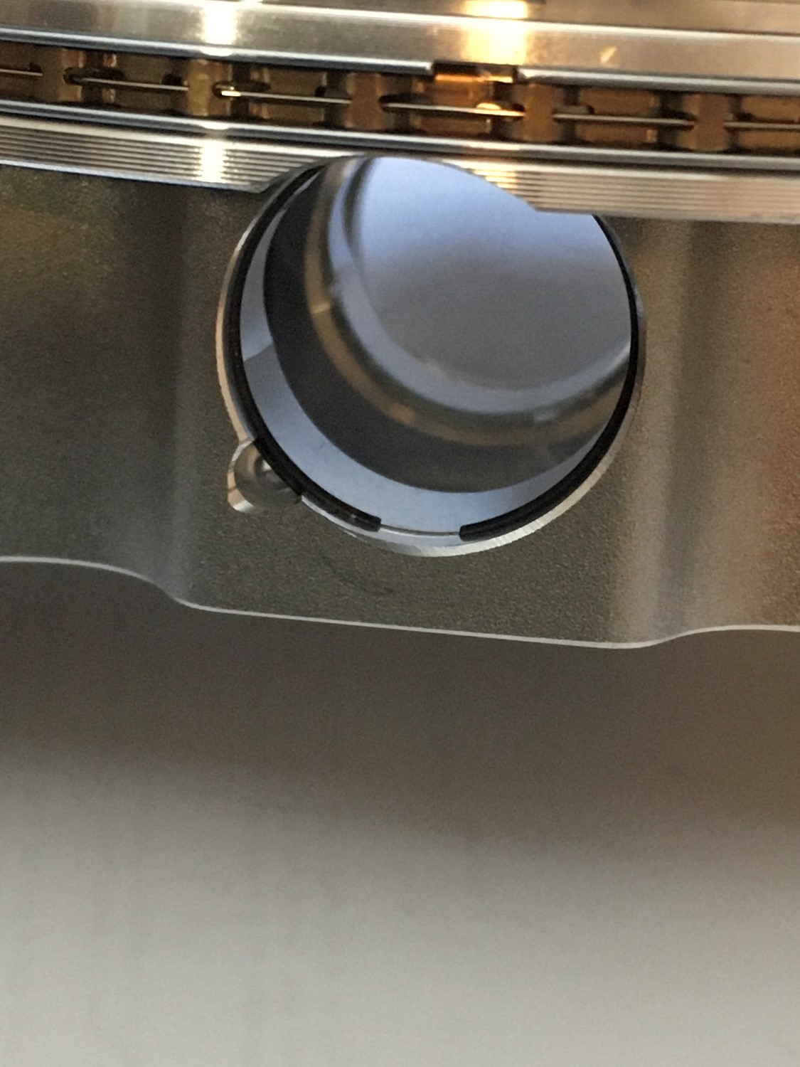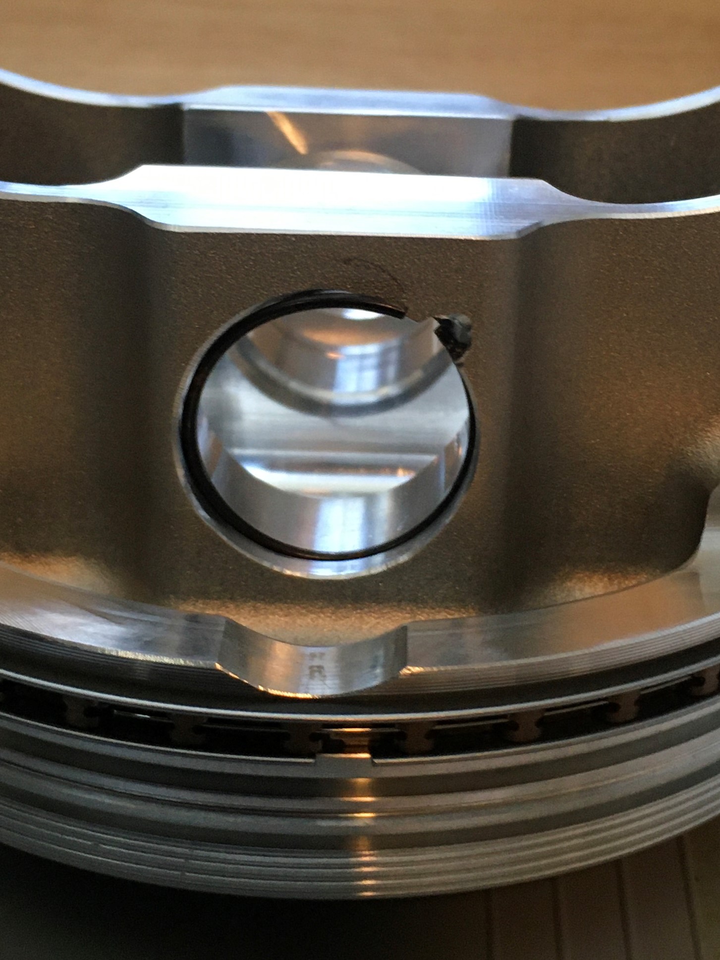 Install one wrist pin circlip in the piston. Be careful not to distort the clip. Wiseco uses wire clips, I assume they are made from spring steel. I like to get them started in the groove and then use my fingernail to pop the free end into the bore. Don’t get too aggressive with these clips. You don’t want to deform the clip and end up with it flying out at 6500 rpm. Here you see the clip started in the groove with the free end just peeking out. All it takes from here is a little help from your thumbnail to pop the clip right into the bore & groove.