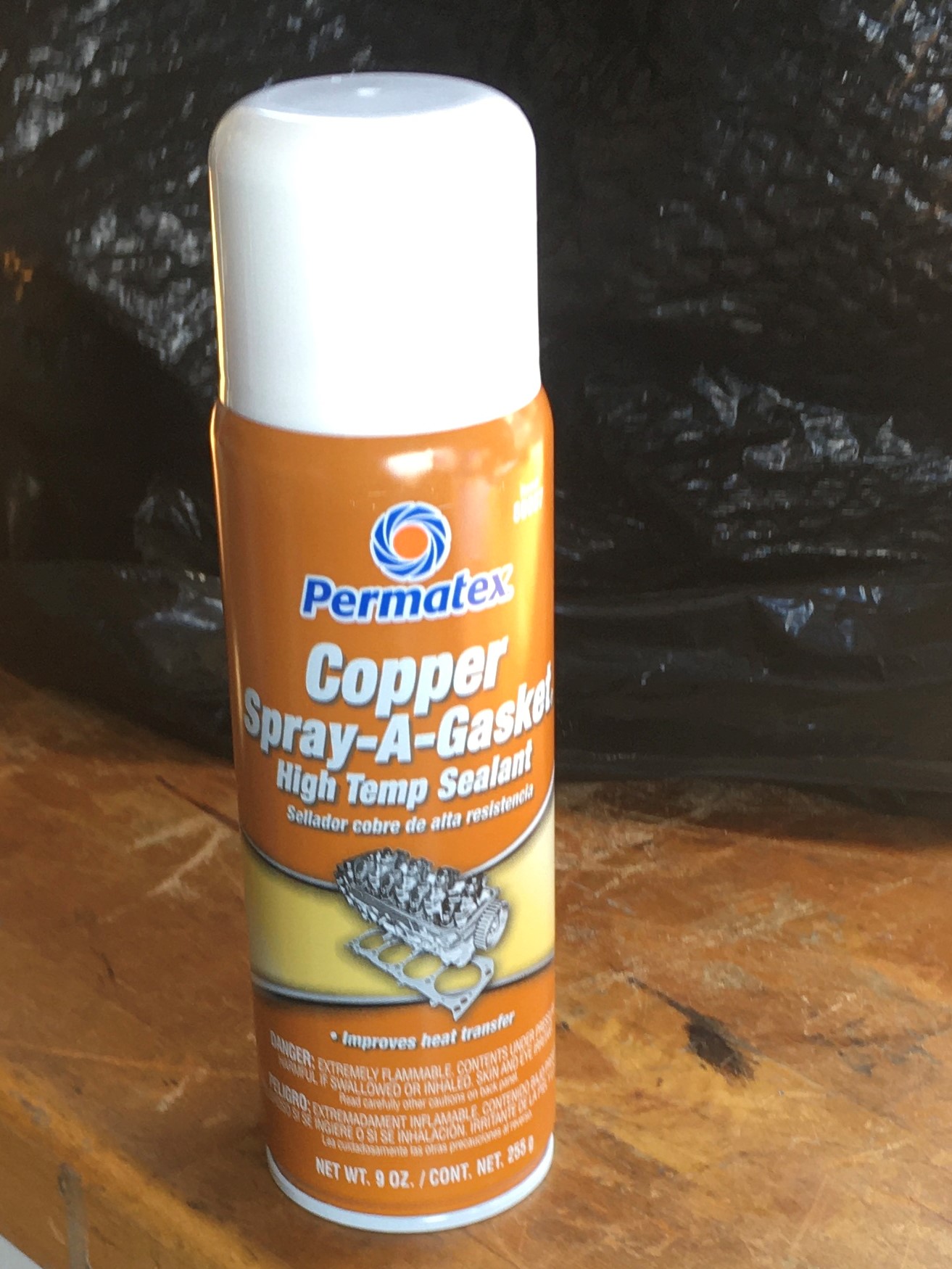 Copper Gaskets Unlimited (CGU) recommends two sealants for their head gaskets, Permatex Ultra Grey 3294 or Copper Coat. I decided to use Copper Coat because it’s a spray on sealant and the info I found said it is specifically intended for head gaskets. I figured it would provide a more uniform layer of sealant and the suspended copper particles in the sealant would transfer heat better. See in the picture how it actually shows a cylinder head and head gasket on the can?????