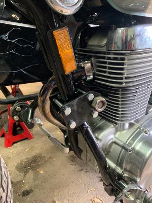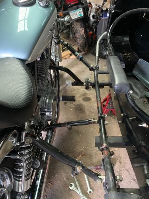 I pulled the sidecar out of mothballs and started figuring out the mounting. The main frame mount looks like it will work. A little concerned about how far back the hack wheel is tho. I think I can adjust it forward once I get everything tied together.