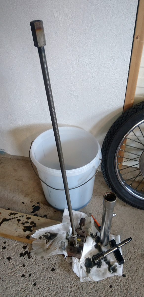 Once the caps come off, with a come along holding the front up, pull springs, drop tubing in, pull a vacuum on the jar, oil falls in, lower the bike, work it out.