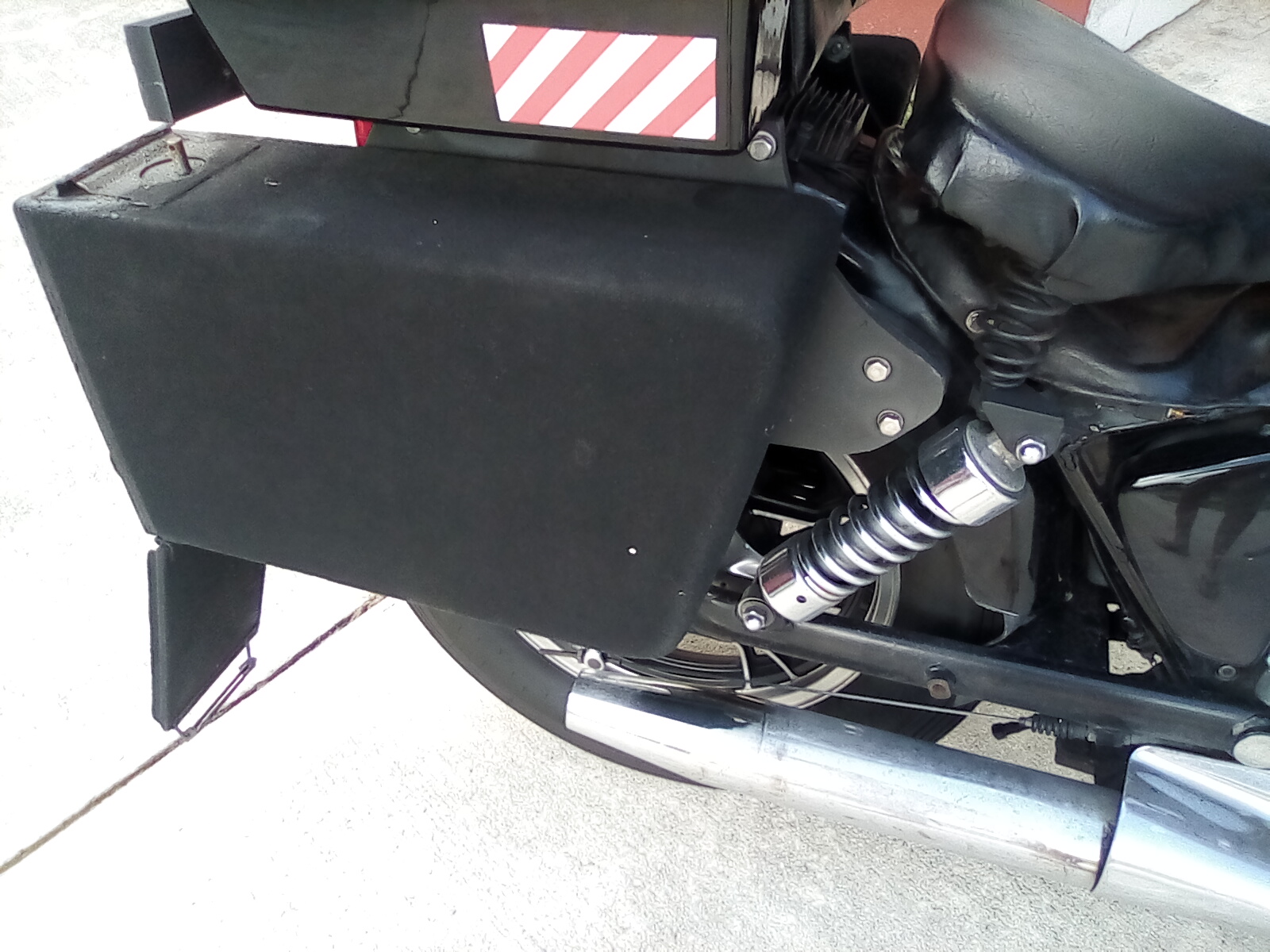 The bags and box mount is a piece of 1/2'' black PVC I scrounged from behind a sign shop. Bolted to the chrome side rails and across the top. The box sits on top, and the bags bolt to the sides.