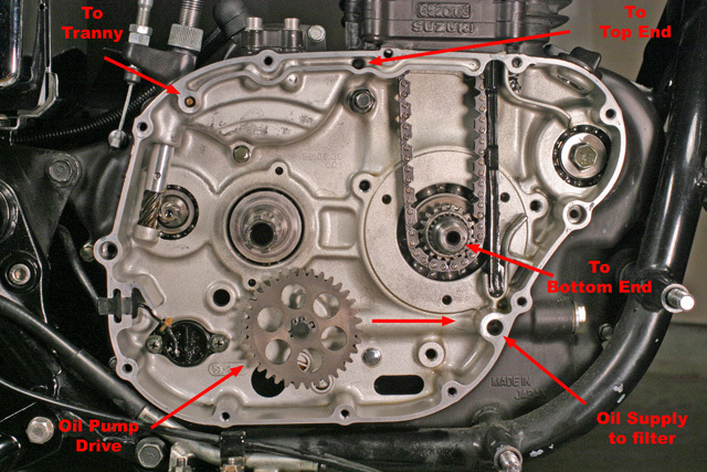 First thing I did after taking possession of the bike was change the oil. (not the filter) It had a strange dull look to it and was thicker than what I would have expected. Wondering now if the previous owner tried using some sort of 'stop leak' to 'fix' the head plug leak. He did mention doing some work on the clutch and the side cover gasket doesn't look OEM. Sticks out about a quarter inch around cover. Someone on this forum mentioned the importance of using an OEM gasket and judging from those photos you posted of the oil passage locations, a badly fitting gasket might block those passages. Another post mentions losing the locator pin behind the oil pump gear when taking off clutch the basket causing the oil pump to disengage. Only one way to find out.