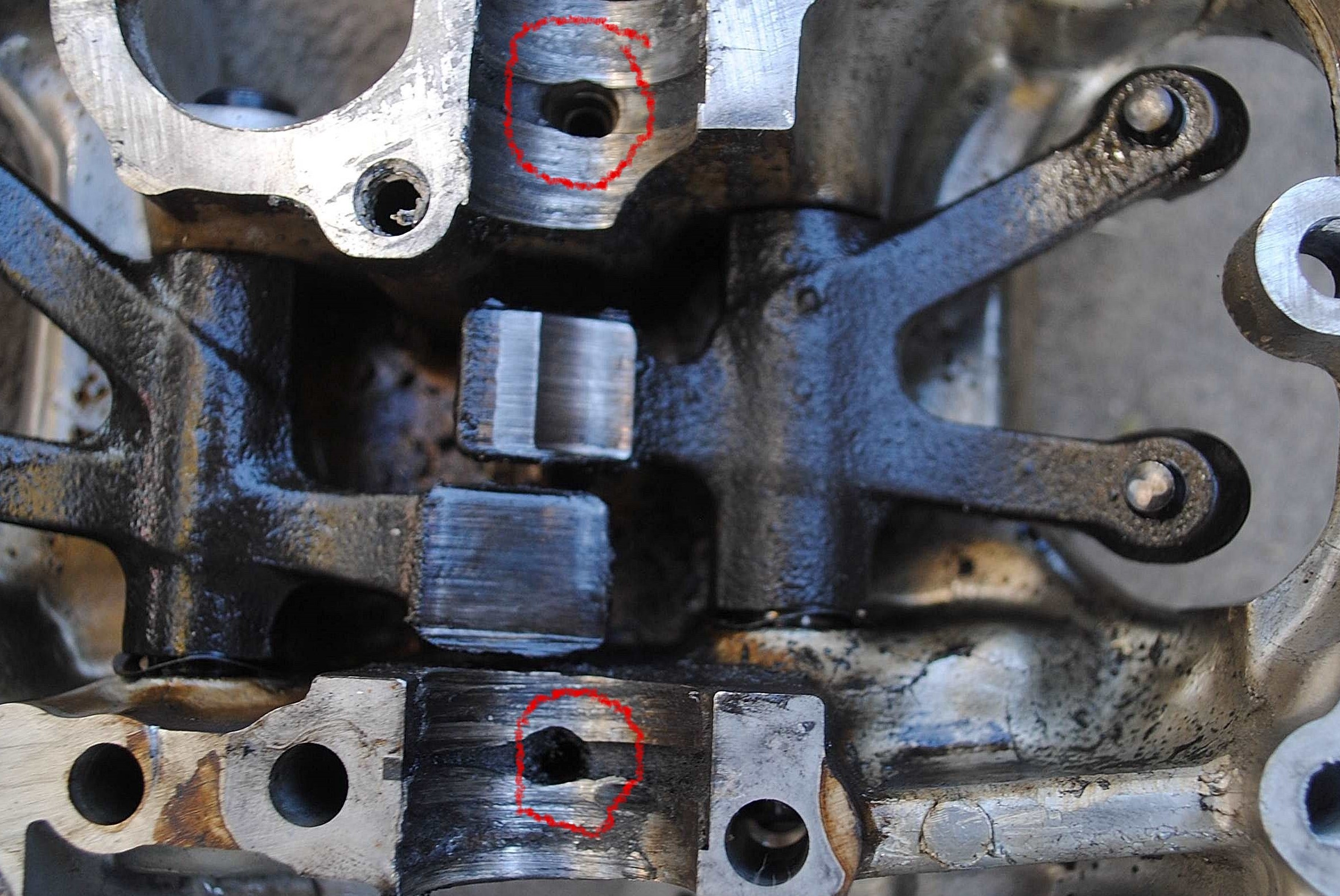 Then the pressurized oil flows through passages in the head cover to the two cam bearings. The oil enters each bearing through these feed holes.