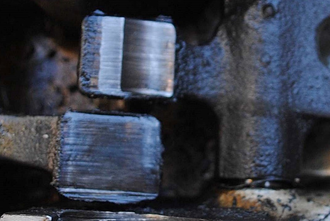 Each bearing has chamfers at the split line. These chamfers are critical as they route pressurized oil off the bearings to the oil reservoir (trough) for the cam lobes and also to the center of the hollow camshaft. The chamfers are shown here.
