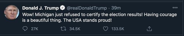 An example, even though it's fcuking obvious that not only has Trump lost but he's lost in a pretty big way that precludes even a sham attempt at bs. But he will still just post the strange "we will win" in all block caps.