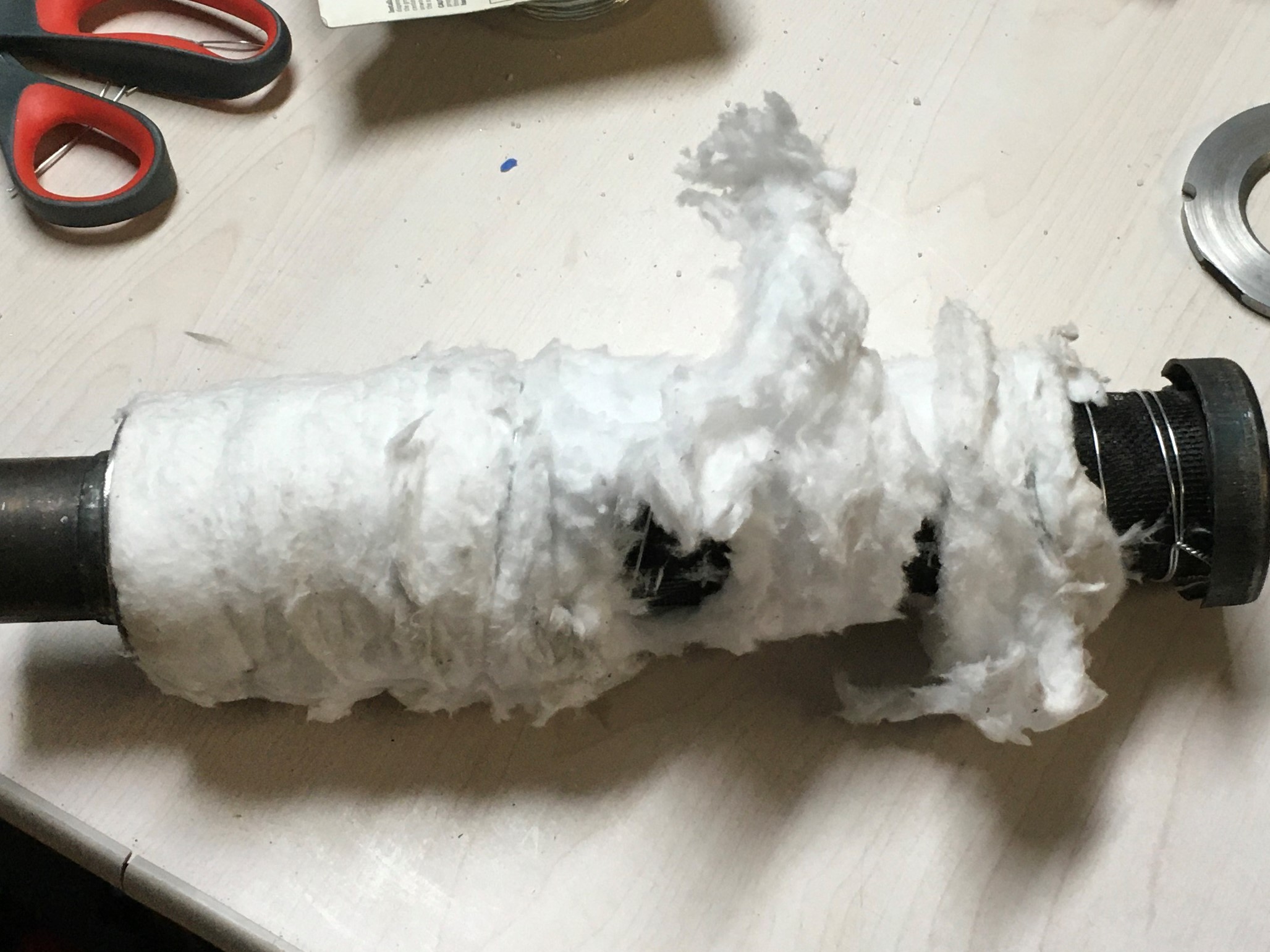 Now continue filling the area between the core and the muffler shell.  Just tear off small pieces of packing material and push them through the opening.  Be sure to evenly distribute the wool packing around the core so that the core remains centralized in the muffler.  You end up with this.
