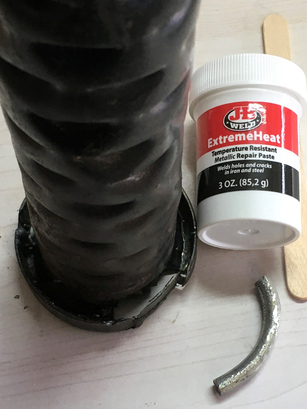 I fixed the damage on the core with a short piece of ¼” mild steel rod and some JB Weld Extreme Heat putty.  The putty is supposed to be good to like 2300°F.  I bent the rod and filed it to provide a nice fit.