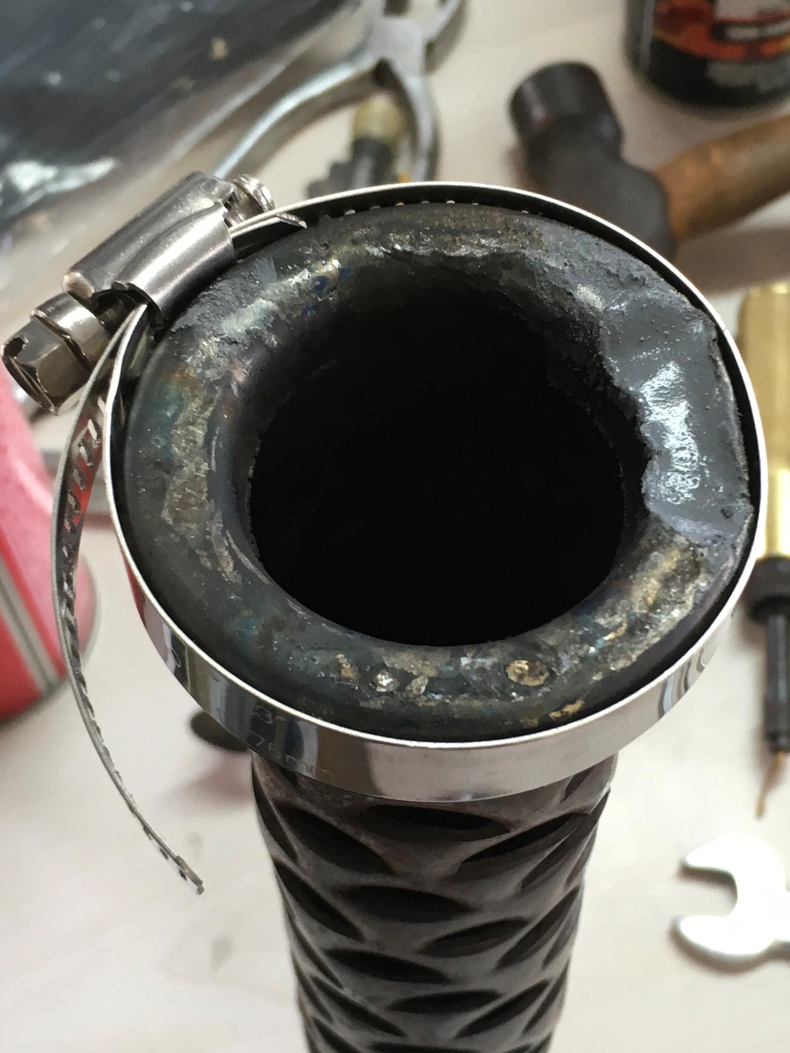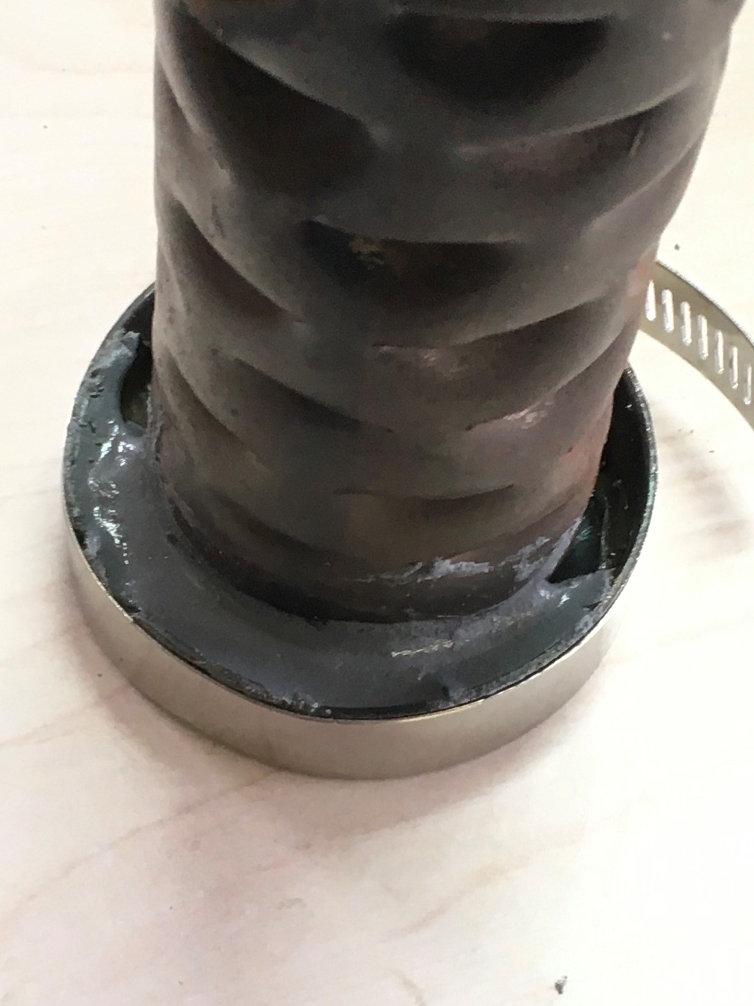 Applied more putty on the other side.  The hose clamp keeps things round as the putty sets up.