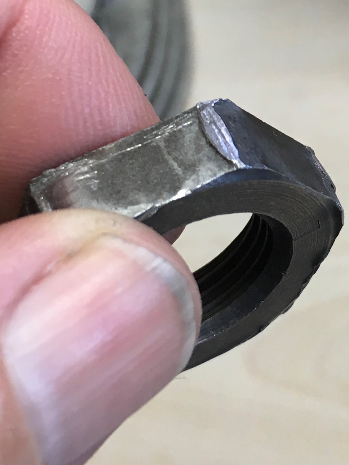 I also wanted to share this with you.  This is a picture of a primary drive gear nut.  It has obviously been grossly over-tightened.  My guess on this screw up is that someone was working on the engine and they were not aware that the nut has left-hand threads.  They tried to remove the nut and just kept reefing on it until the corners folded over.  I suspect the drive sprocket on this engine was toast by the time they figured out the nut is left-hand.  You can actually see the "L" stamped on the face of the nut indicating its left-hand.