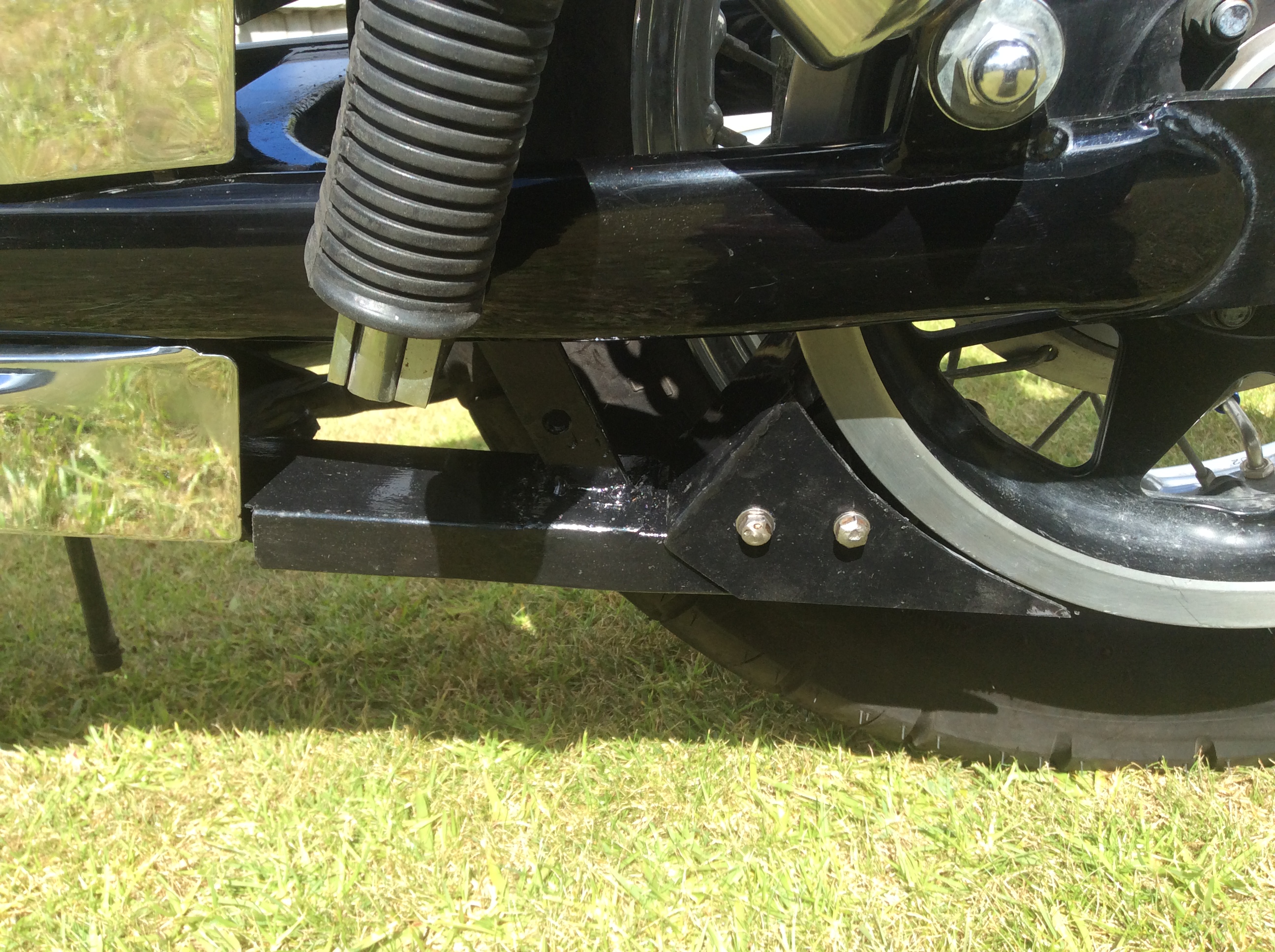 I turned the footpeg capscrew into a stud by cutting off the head and welding on the shank of a short 10mm bolt The space where the cap screw head was is filled up with 4[5] ? spring washers which fitted perfectly The strut that supports the guard is held to the stud and swingarm by a nyloc nut This makes a strong mount The front of the guard is held by a 2mm plate that picks up the 2 6mm setscrews in the front of the swingarm