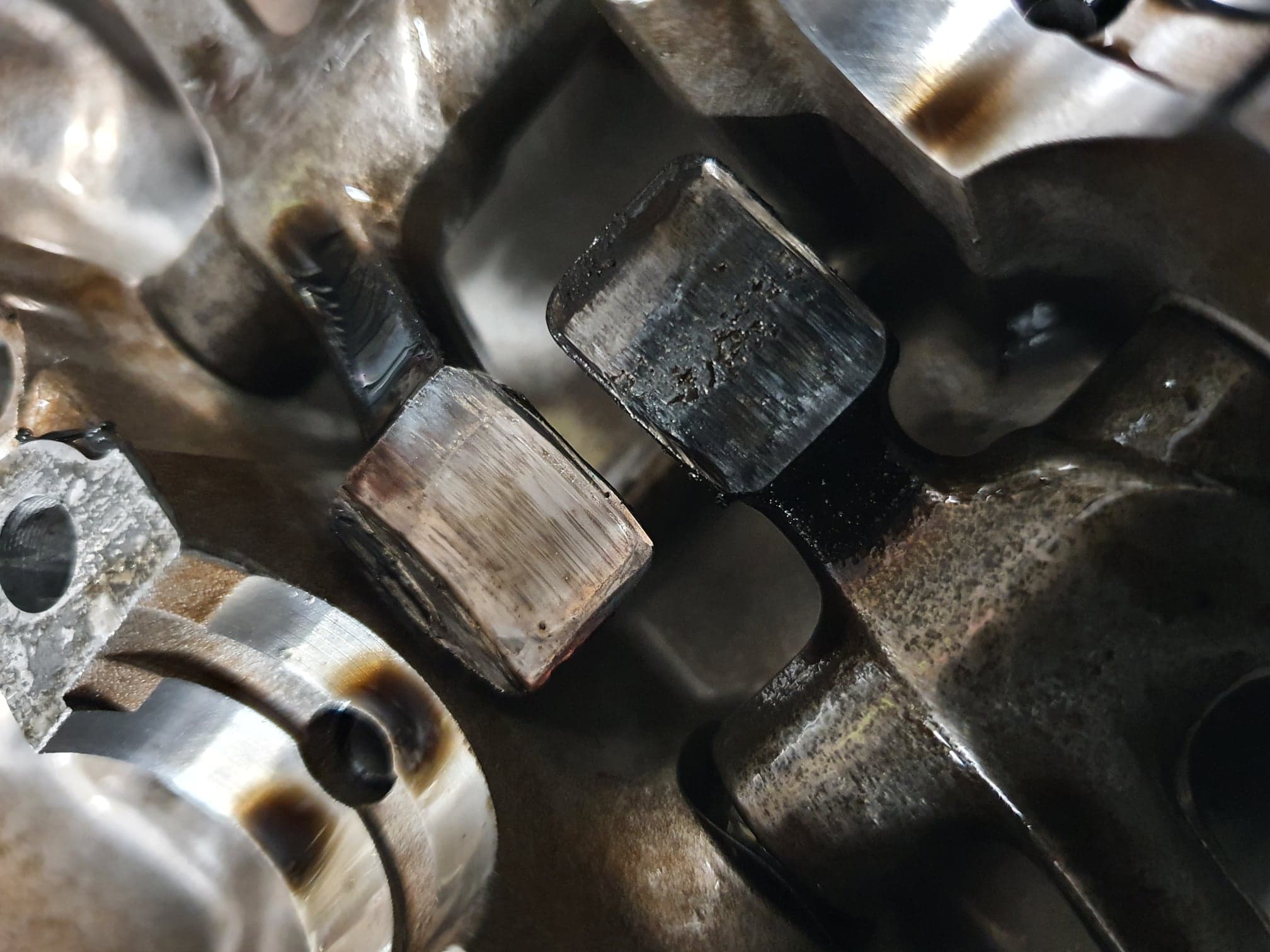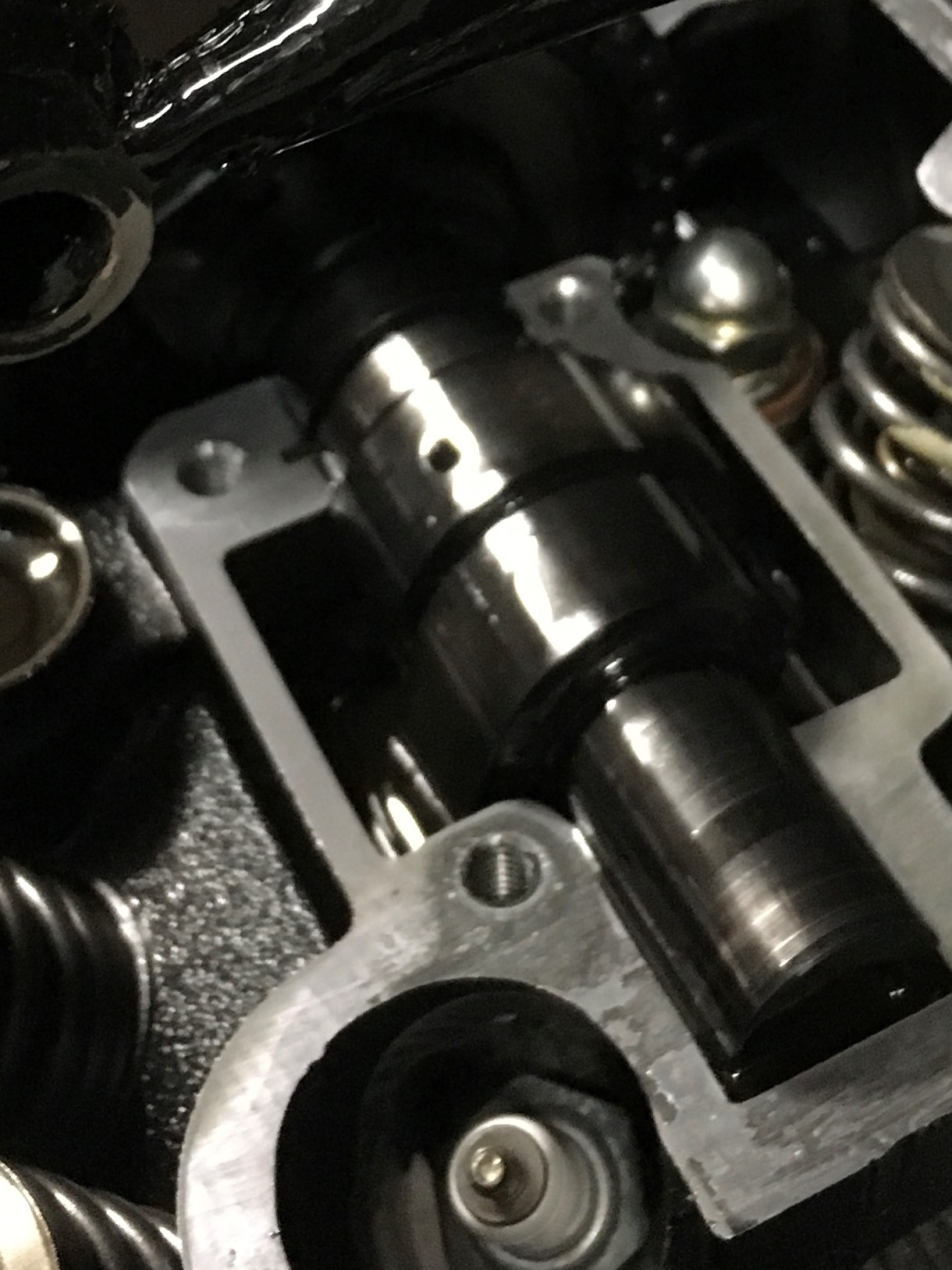 My NEW mechanic said the case hardening on the rocker arms was probably worn thru when the old mechanic fitted the D R cam and the roughness has ground down the already worn cam.