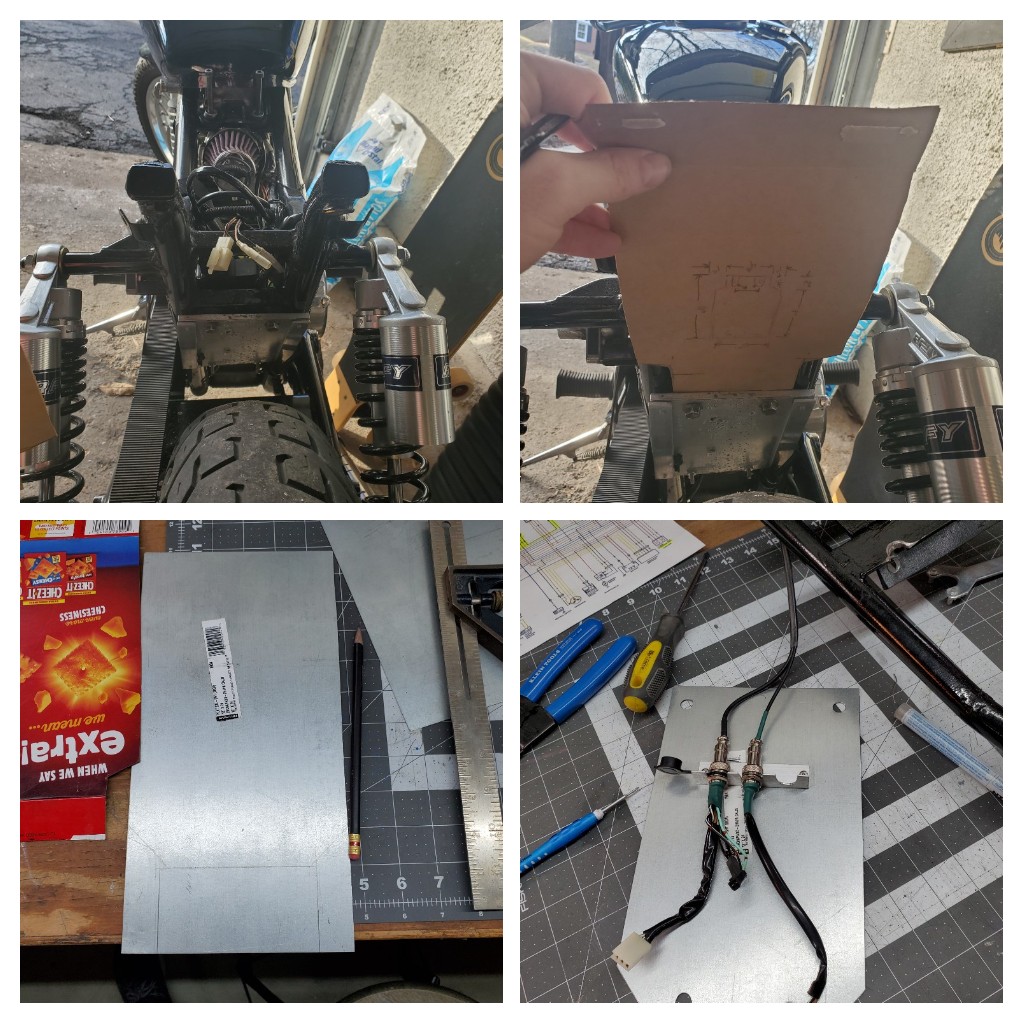 Update: Not much progress. I actually went backwards some. I made an aluminum plate with a mount for the connectors and it works great. The issue was I got too excited and didn't double check everything before going out for a ride. The new license plate mount didn't have enough clearance with all the travel the new rear shocks provide, and I hadn't gotten locknuts for the screws holding it. Mid ride I heard something and looked down. The mount was dangling right above the tire from the electric cable. Pulled over, disconnected electrical using the trusty new aViAtOr ConNeCtoR  Cheesy and came on home. I ended up heating up the aluminum bar stock I used for the mount and bending it to get the extra clearance. Put it back together, turned the key and saw smoke come out of the license plate light. I should have check the connection to the light after the stressed from dangling. The wires were stripped and shorted out. No license plate light atm.  Undecided on the bright side, I love the bike. It's really fun to ride and I can't wait until I can get the rearsets on.
