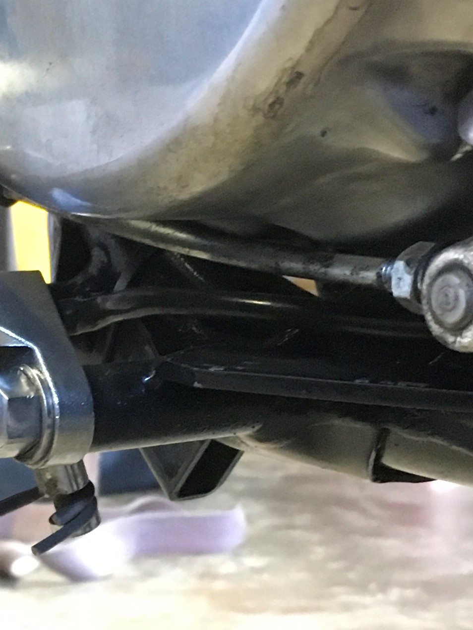 Also make sure that your shift pedal/lever does not hit the frame on upshifts. You can see from this picture where to check. You can adjust the length of the shift rod (make it shorter) to increase the clearance between the frame and the pedal/lever.