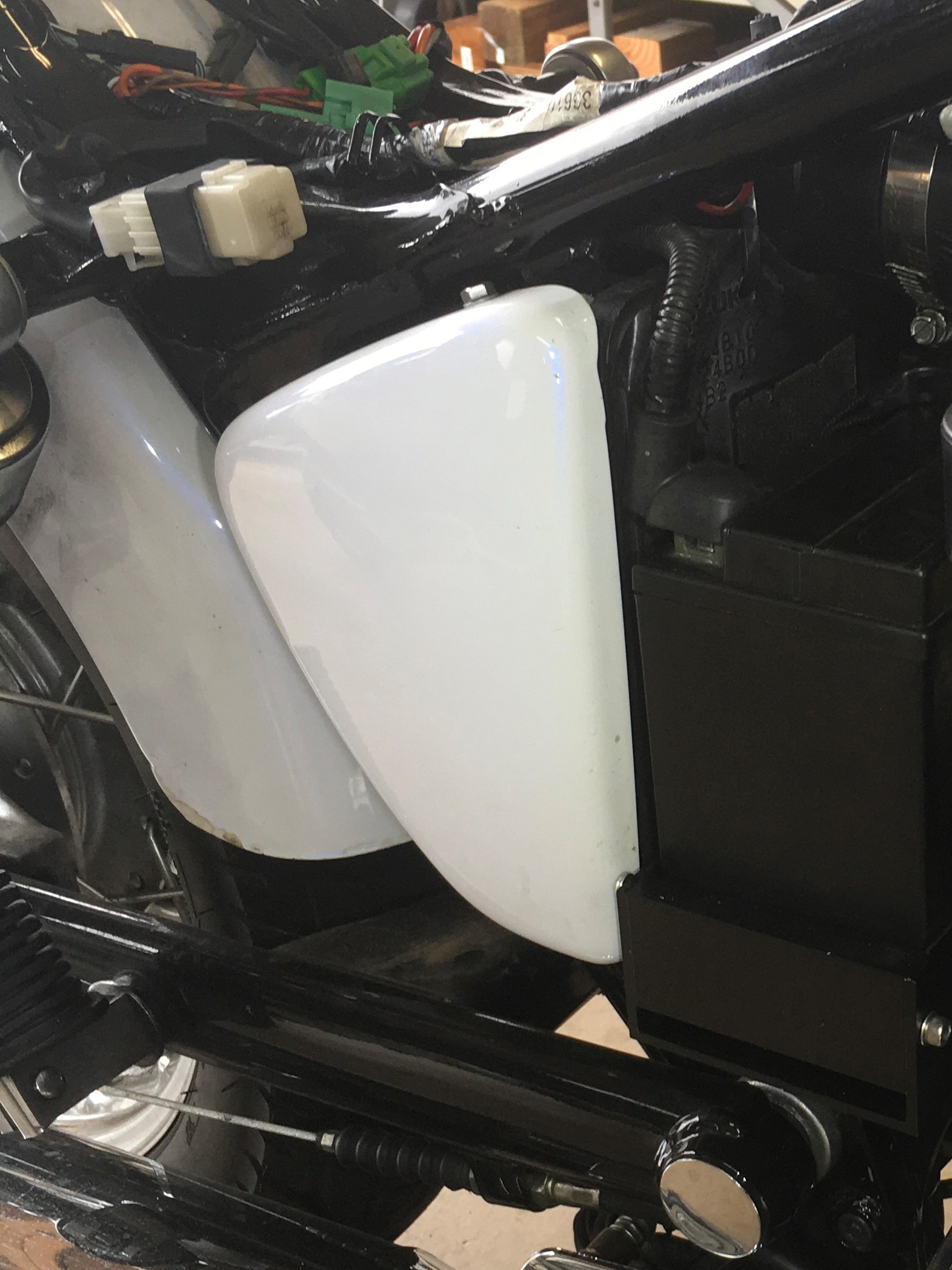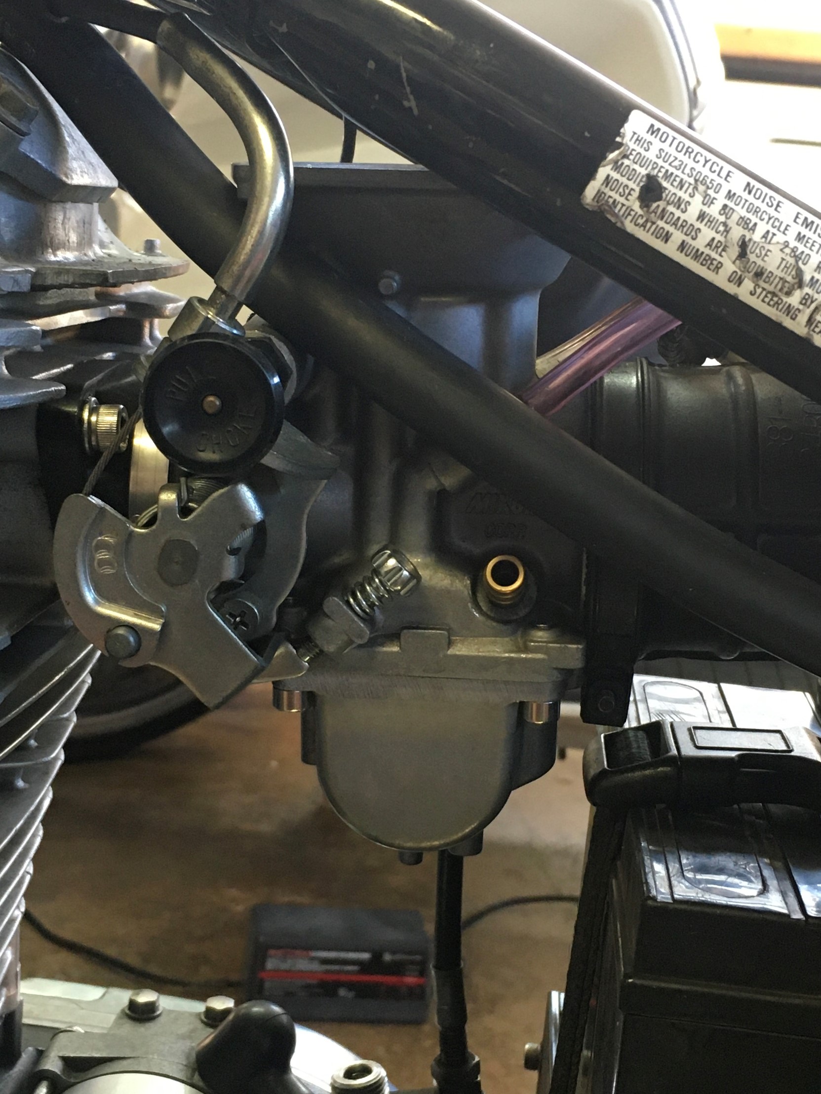 If you still have the stock battery box, it might be a bit tricky to remove the float bowl.  A smaller battery makes things a lot easier.  This is a Sportster battery.  Lots more room with this setup and replacements are easy to find.