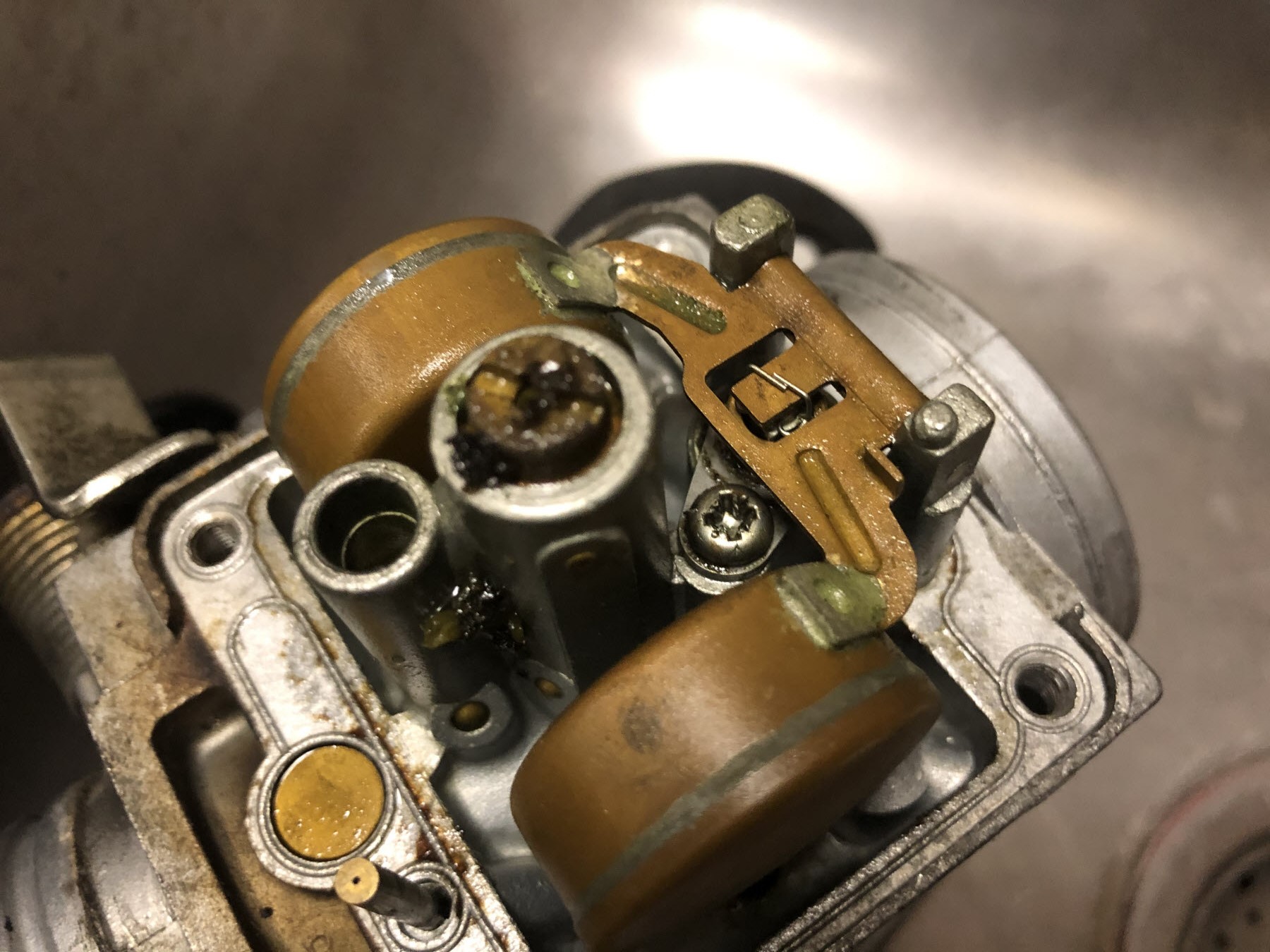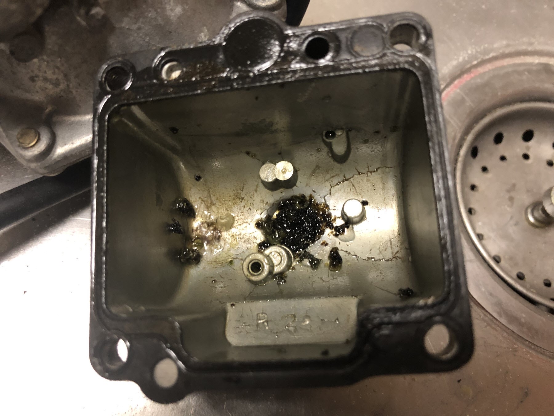 I started on the carb cleaning......it had pretty typical gunk in the float bowl.