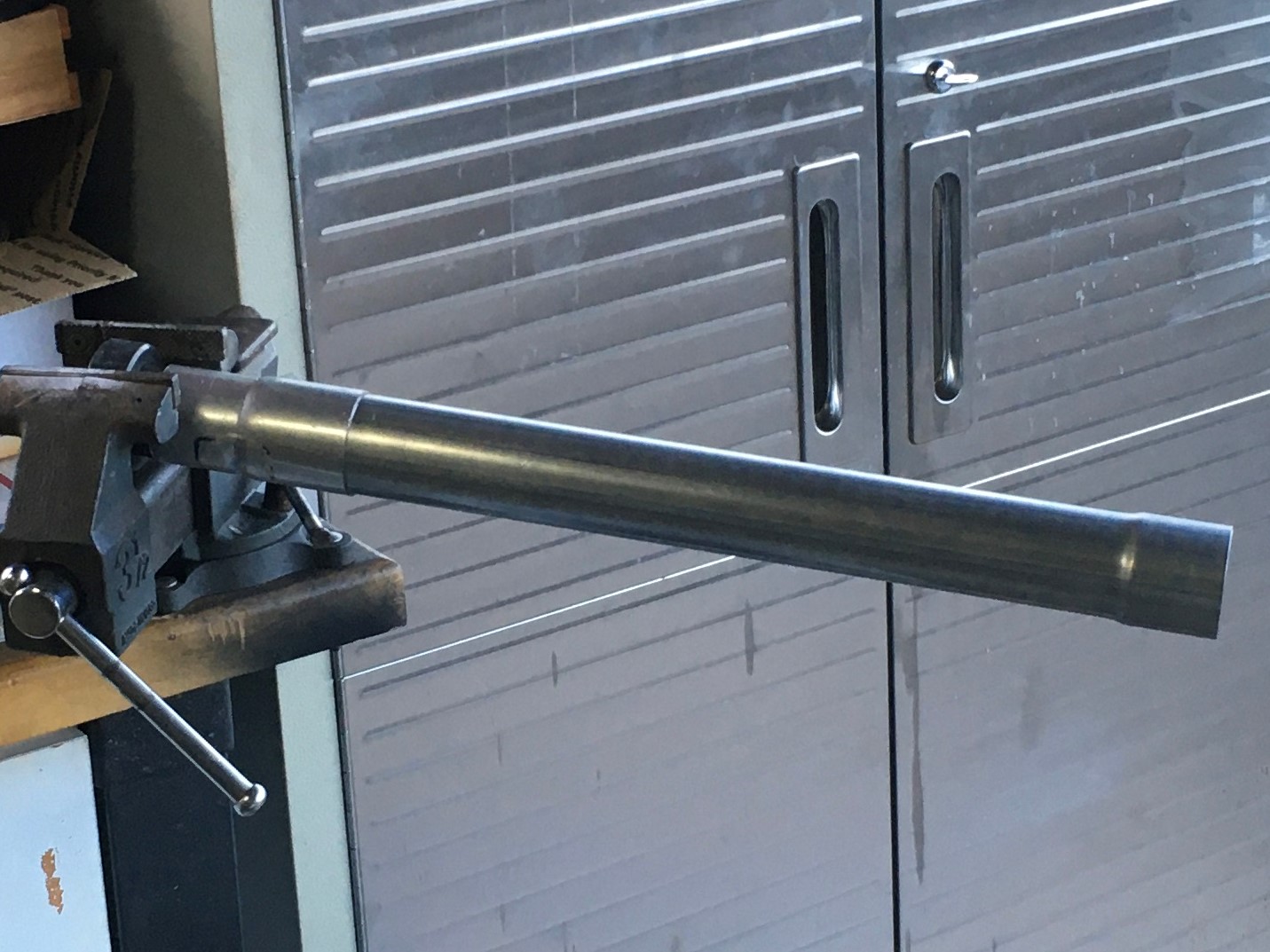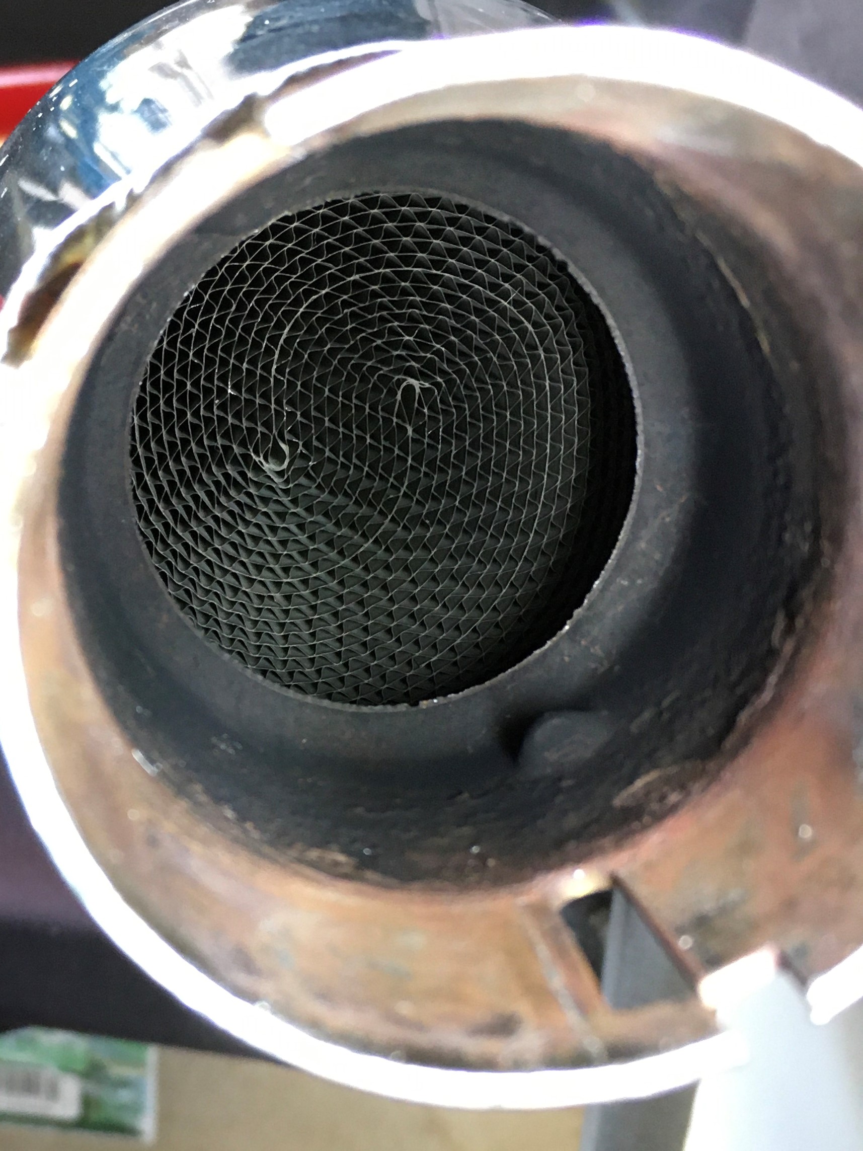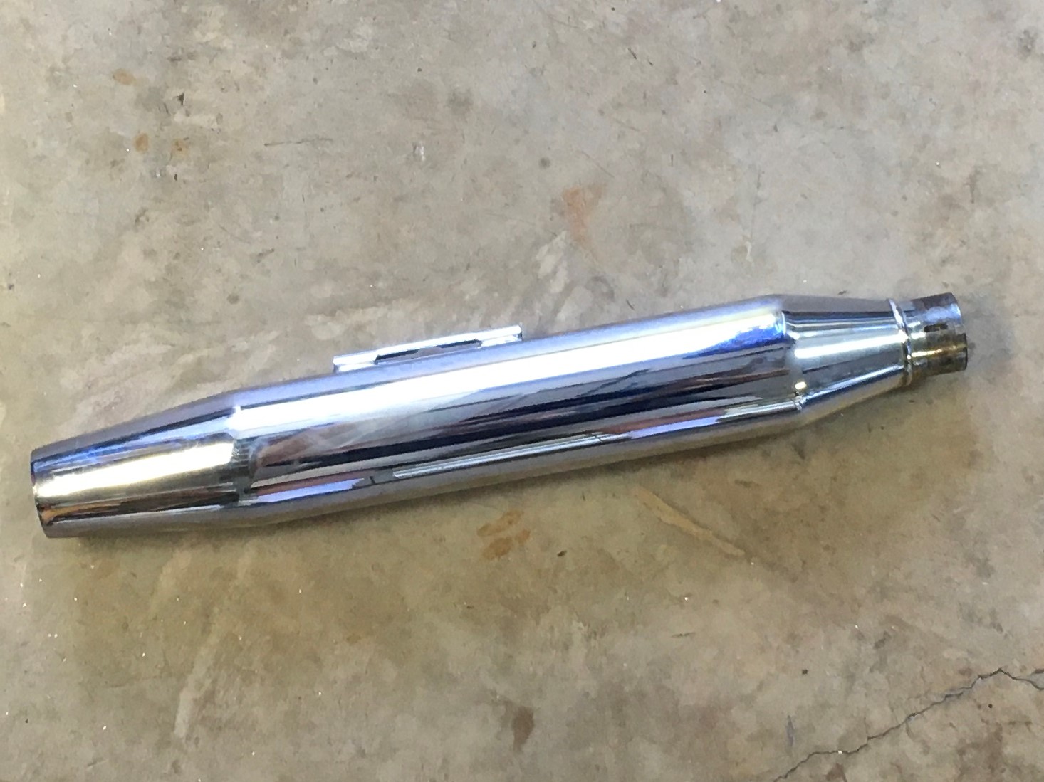 For this experiment, I will be using a stock Harley muffler of unknown pedigree.  I know it’s off a Harley.  I know it has a catalyst.  I know it’s chrome.  It has a 1.75” inlet.  That’s about it.