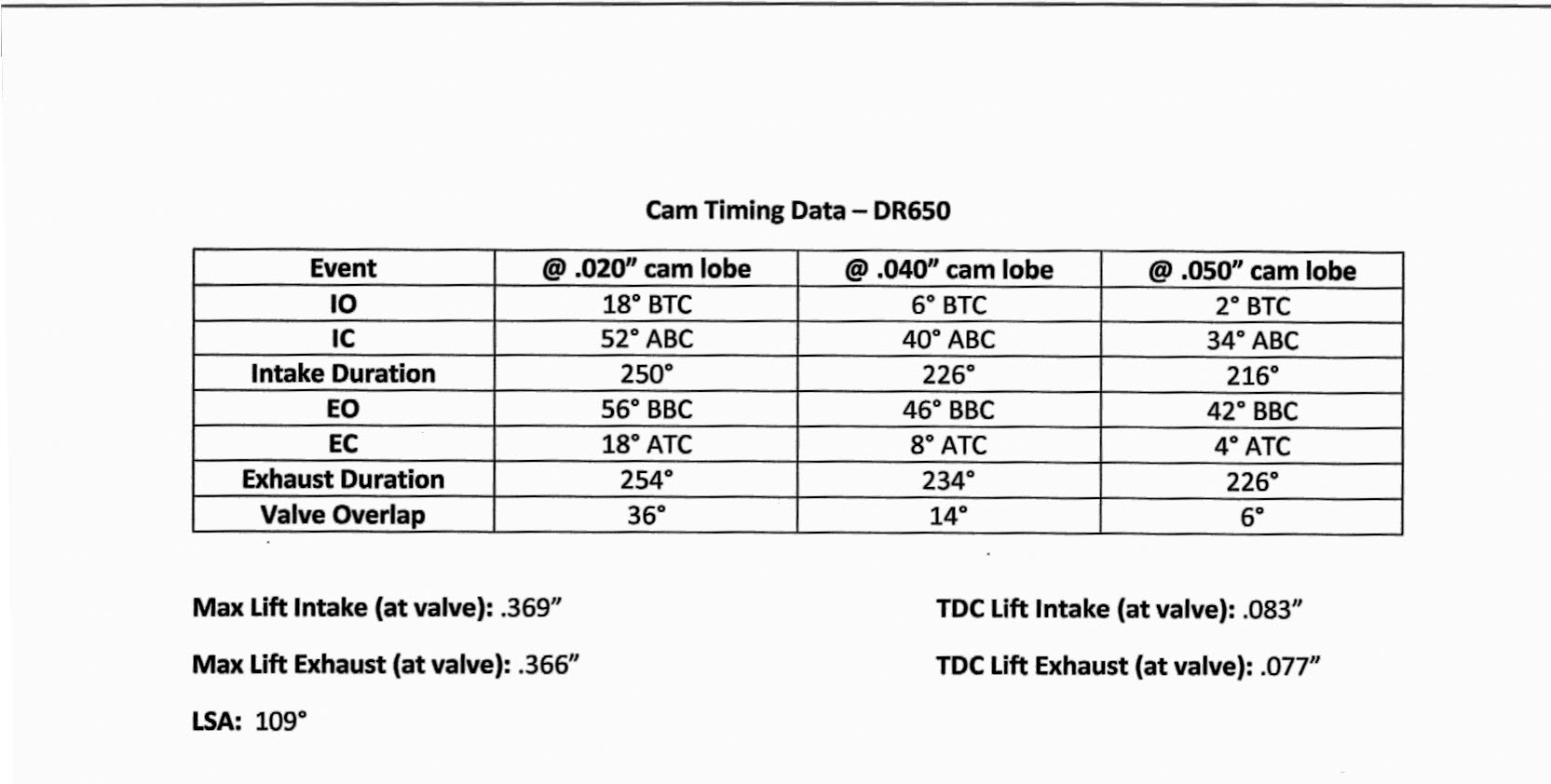 The DR650 cam is a bit spicier.  It has about .020” more lift, about 20° more duration, and a spoonful of valve overlap to zip things up.  At TDC, the valves are open enough to allow some flow, but they aren’t open so far that you have to worry about interference with the piston.  Now the inertia developed in the rapidly exiting exhaust gas can help pull a fresh intake charge into the combustion chamber.