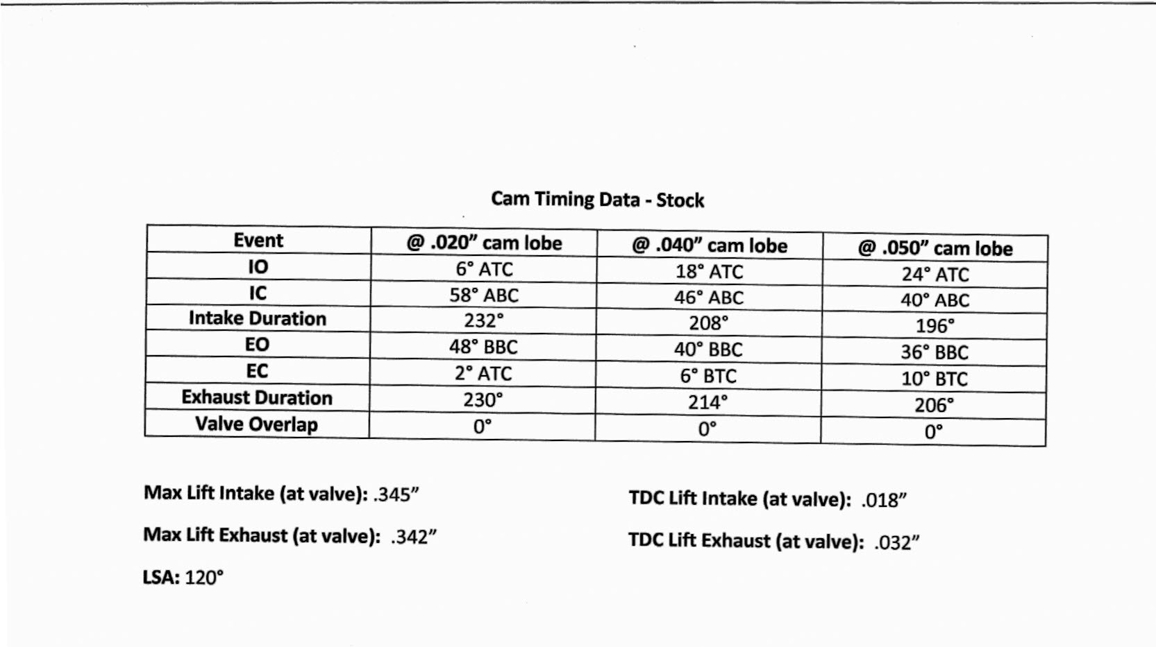 The table below provides timing and lift data that I took on a stock cam.  You can see that at any of the usual arbitrary lobe lifts (.020”, .040” or .050”) there is zero overlap.  If you look at the valve lift at top dead center (TDC), you can see the valves are barely open (.018” intake, .032” exhaust).  Not much air is gonna squeeze past a valve that’s only open .018”.