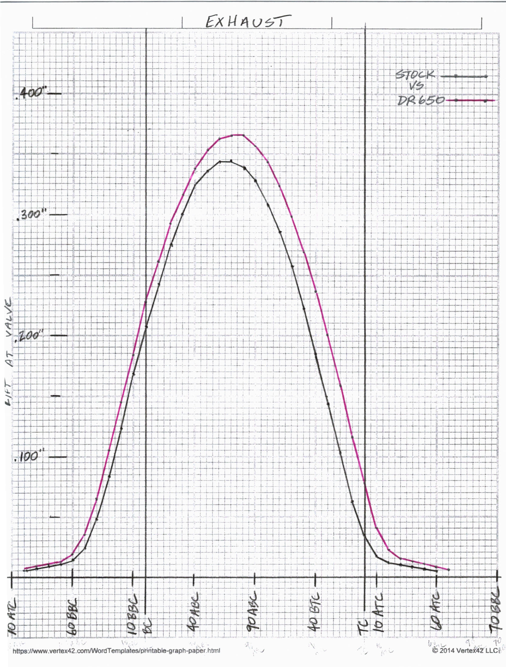 Compared to the stock LS650 camshaft, the DR cam has more lift, more duration, and some valve overlap.