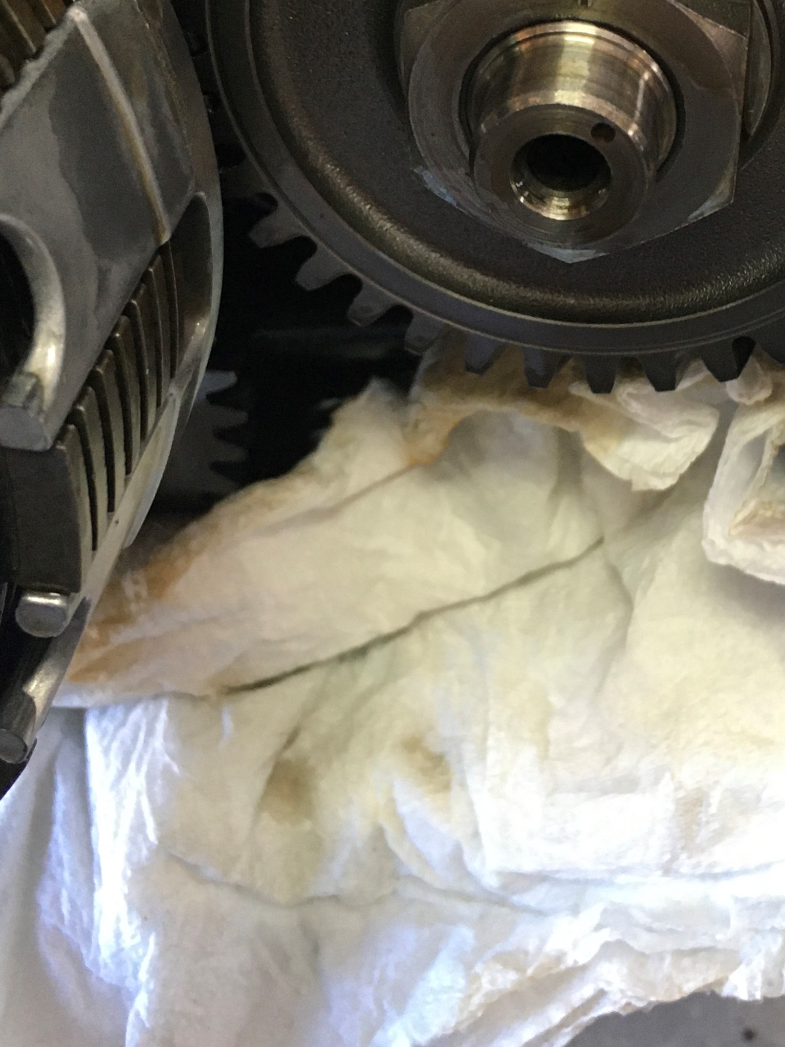 To prevent losing any small parts in the engine, it’s a good idea to place a clean paper towel in the openings below the clutch.
