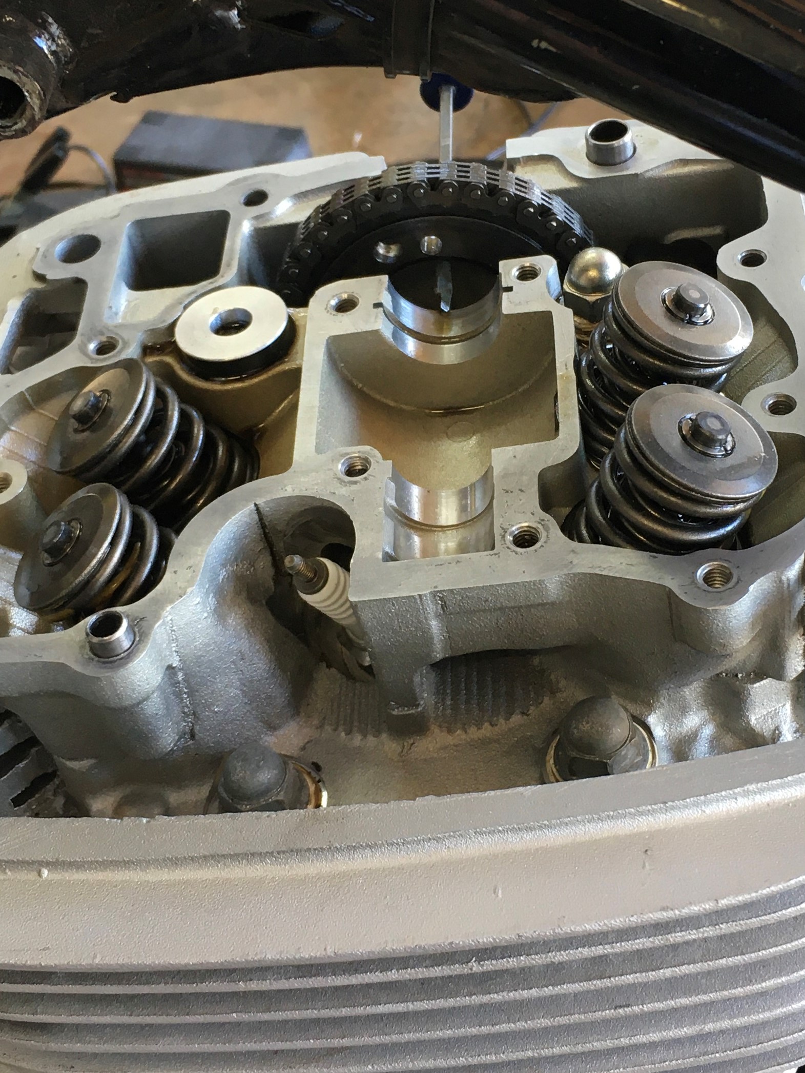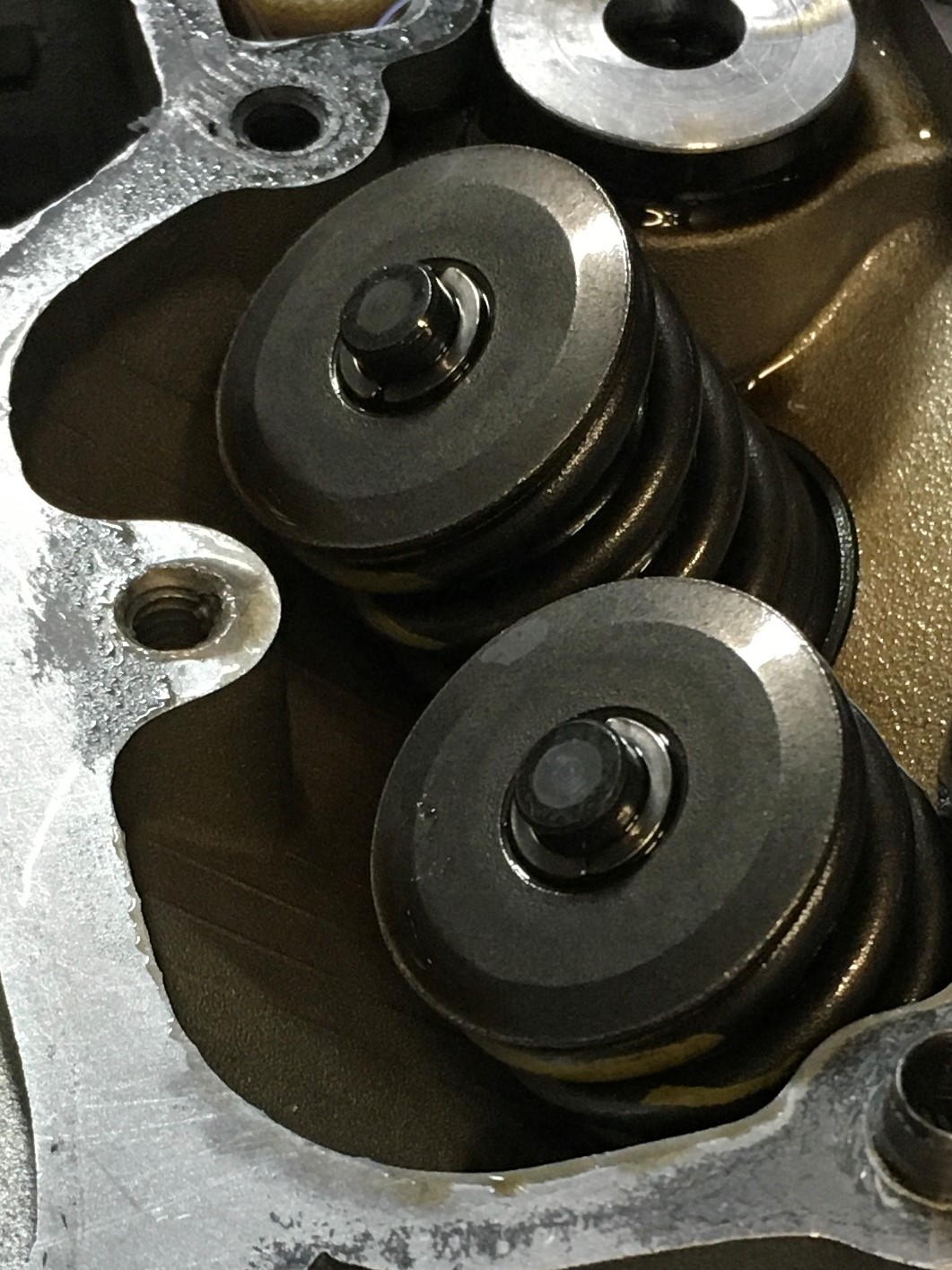 Inspect the valve stem tips. You want nice circular wear patterns, no chipping or galling. Make sure the spring retainers are not cocked and the cotters are seated. Check all four valves.